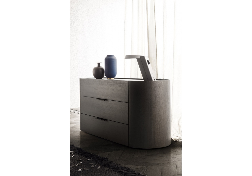 Dedalo designed by Pianca is a dresser with multiple possibilities of use and customization. Made with structure with wood particle panels and lowered top made with panels, covered with different materials. Leather handle. Available with plinth or with metal base.