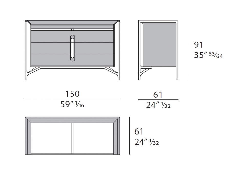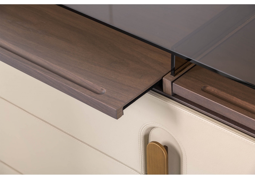Vine designed by Frank Jiang for Turri is a chest of drawers with structure in MDF, plywood, solid wood and walnut veneered particle board panels with leather covering. Bronzed glass top and metal parts in gold or brushed bronze finishes.