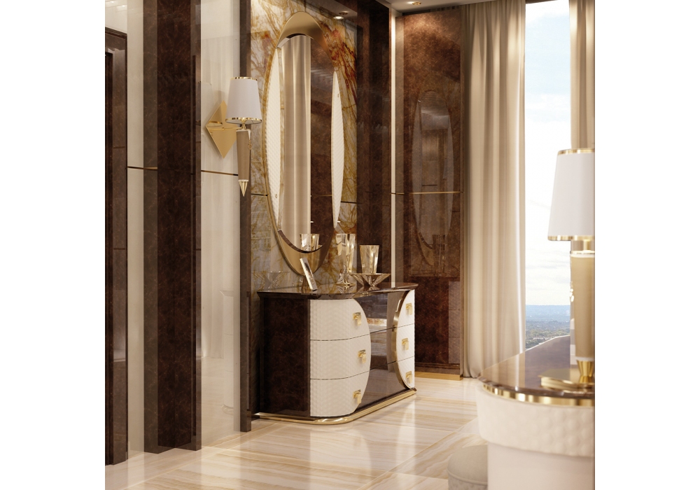 Vogue designed by Andrea Bonini for Turri is a chest of drawers with structure in MDF, plywood and particle board panels in glossy lacquered finish. There are three drawers with internal lining in microfiber, while on the outside they are partially covered in leather with hexagonal embroidery. The top is made of wood. Inside there are two compartments with six shelves.
