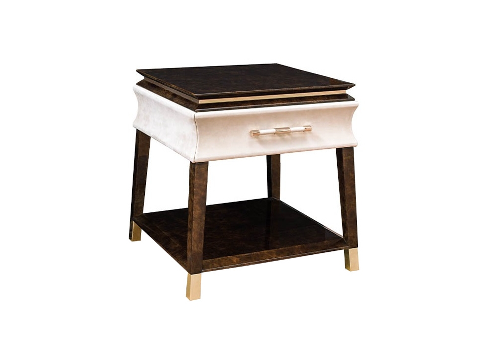 Noir designed by Andrea Bonini for Turri is a bedside table with structure in MDF and particle board panels in glossy lacquered finish, leather covering and top made of marble or wood. There is a drawer with internal lining in microfibre. Feet and metal parts in different finishes.