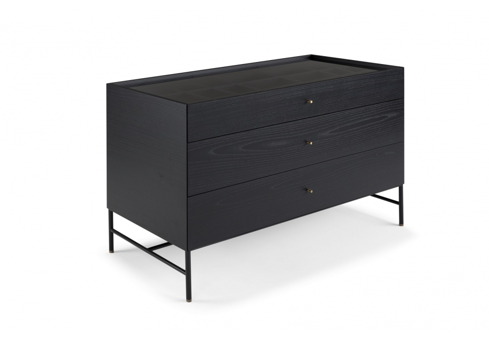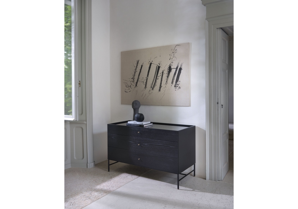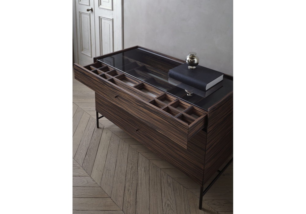 Cricket designed by Dainelli Studio for Conte Casa is a dresser made with a curved veneered wood structure, in different essences or glossy or matt lacquered wood. Top in wood, glass or marble and feet in painted metal with details. Interior drawers in veneered wood, leather effect. Available in different finishes.