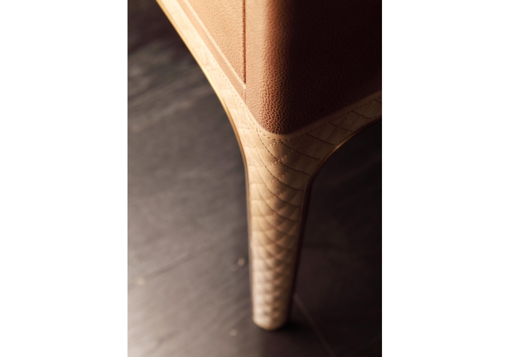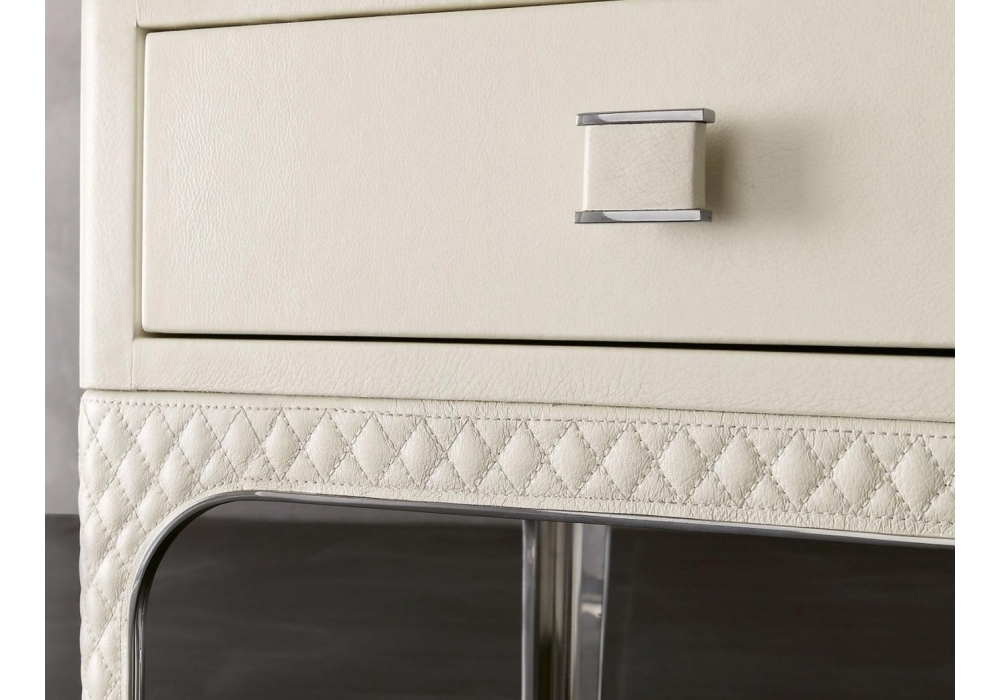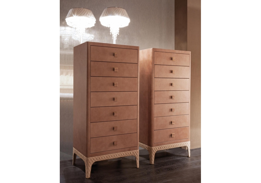 Glen designed by Rugiano is a tallboy with leather covering. Details in steel or bronze.