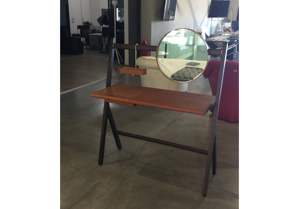 Ren designed by Neri & Hu for Poltrona Frau is a dressing table. It features a round mirror, an oval key tray and a top with a lift-up compartment in Saddle Extra leather with a round-shaped brass handle. The internal part of the compartment is covered with a saddle-leather mat. The Ren complementary furnishing collection is the result of studies of the home entryway by Neri & Hu. Guests are welcomed in this space and it offers them the first glimpses of the personal furnishing style.
