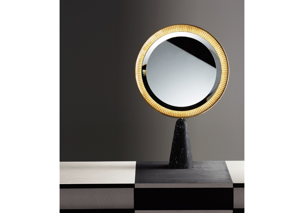 Selene designed by Pietro Russo for Gallotti&Radice is a dressing table in Taba Frisé white wood and Tanganika black wood. Satin brass lacquered metal parts. 6mm bevelled extralight mirror. With LED light (15 watt; 108lm/w; 3000k). Satin brass metal parts and Nero Marquinia marble base.