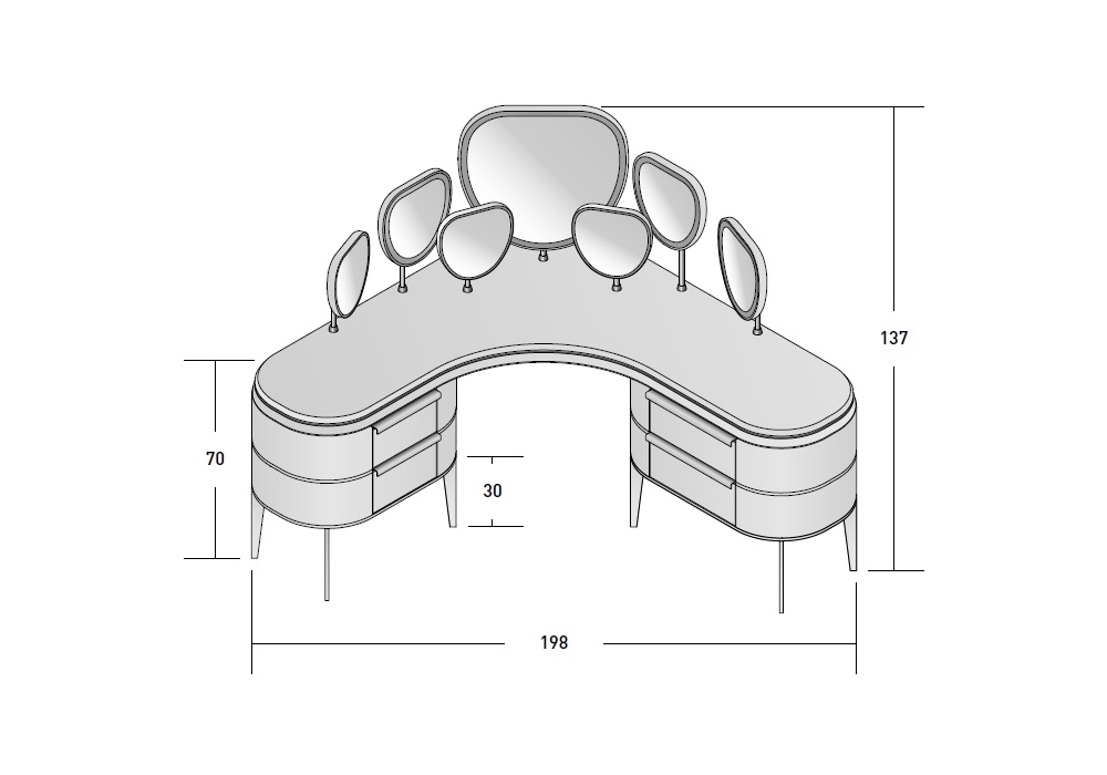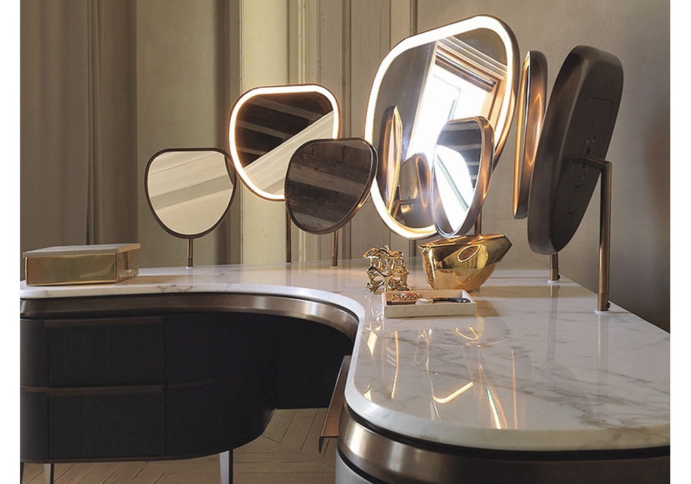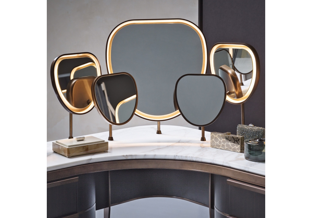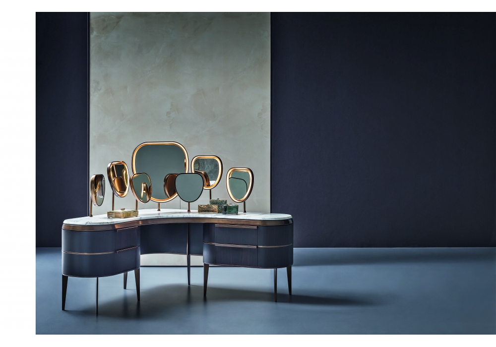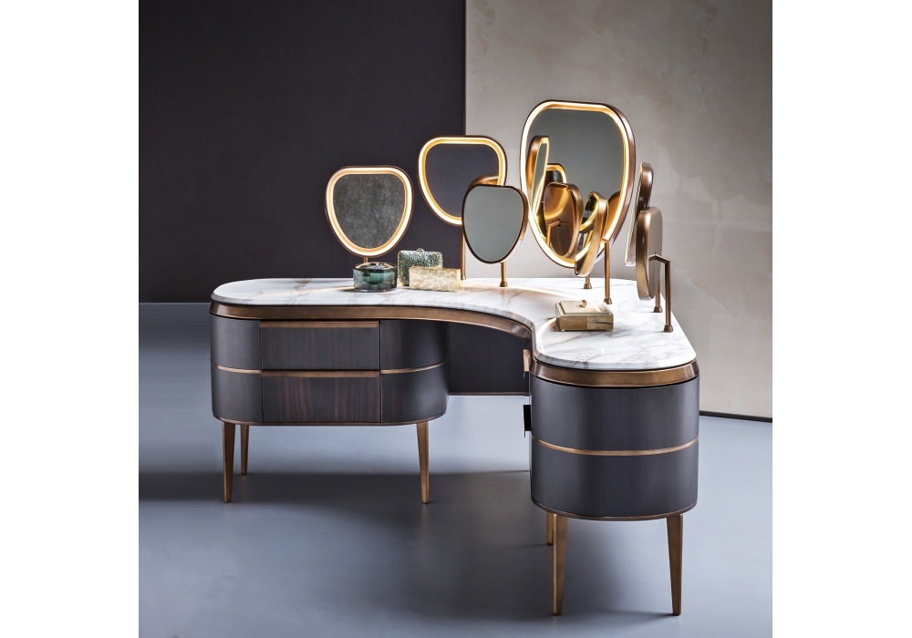 Kara designed by Design Toner for Natevo is a make-up table with mirrors in a range of dimensions and a sinuous structure supported by slim metal legs, antique gold finish. Beneath the luxurious marble top in gold polished Calacatta, there are large, pleasantly-rounded drawers.