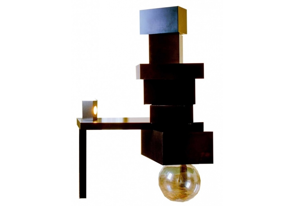 Pauline designed by Bill Woodrow for Memphis Milano is a dressing table with drawer and doors in black lacquered wood with Plexiglass sphere and rechargeable lamp. Limited edition of 25 pieces.