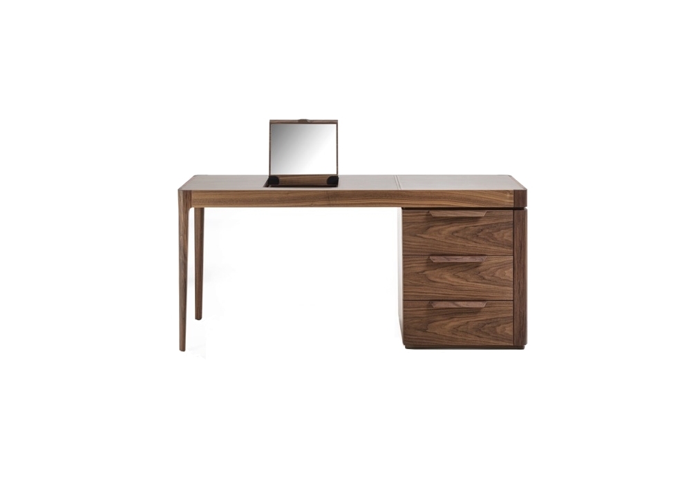 Afrodite Bijoux designed by Carlo Ballabio for Porada is a dressing table with structure in solid Canaletta walnut, side element with three drawers and retractable storage compartment with integrated mirror. Top available only in Cuoietto.