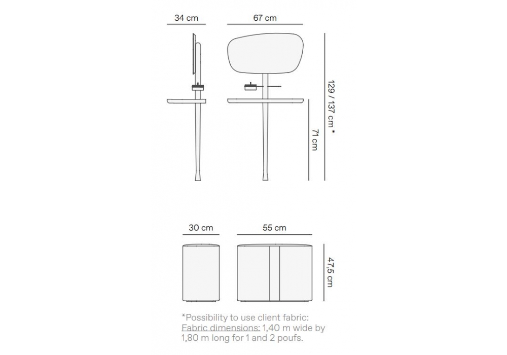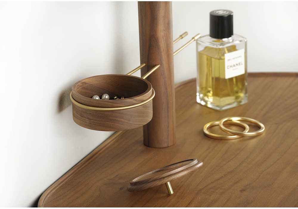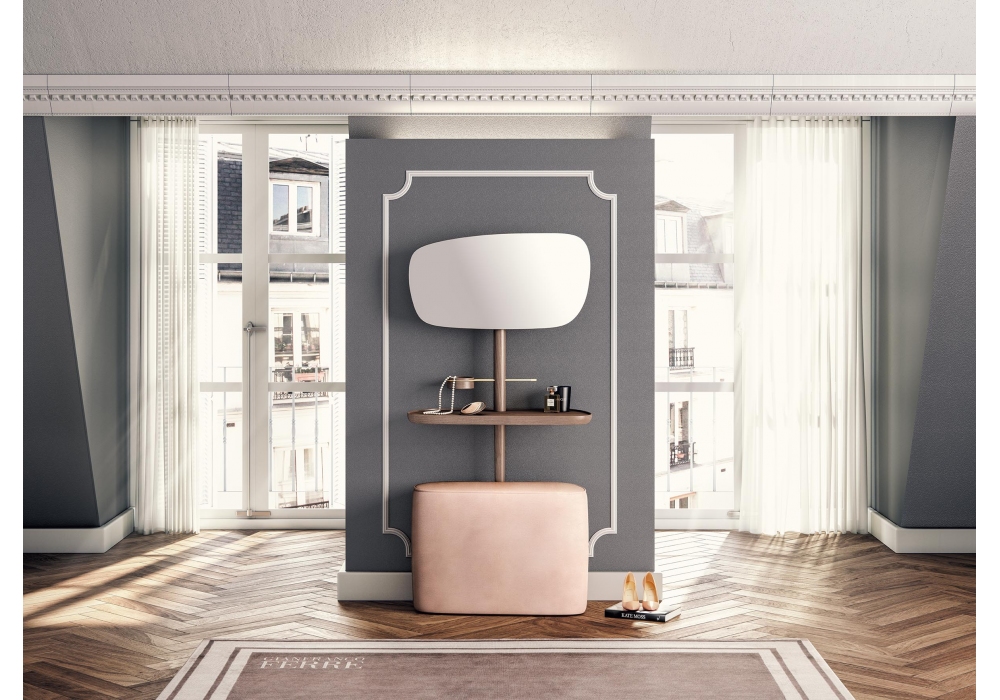 Tocador designed by Andrés Martinez for Nomon is a dressing table with structure in natural walnut or with Black Ash finish, top in walnut or marble in different finishes. The matching pouf is upholstered in velvet, in 3 finishes.