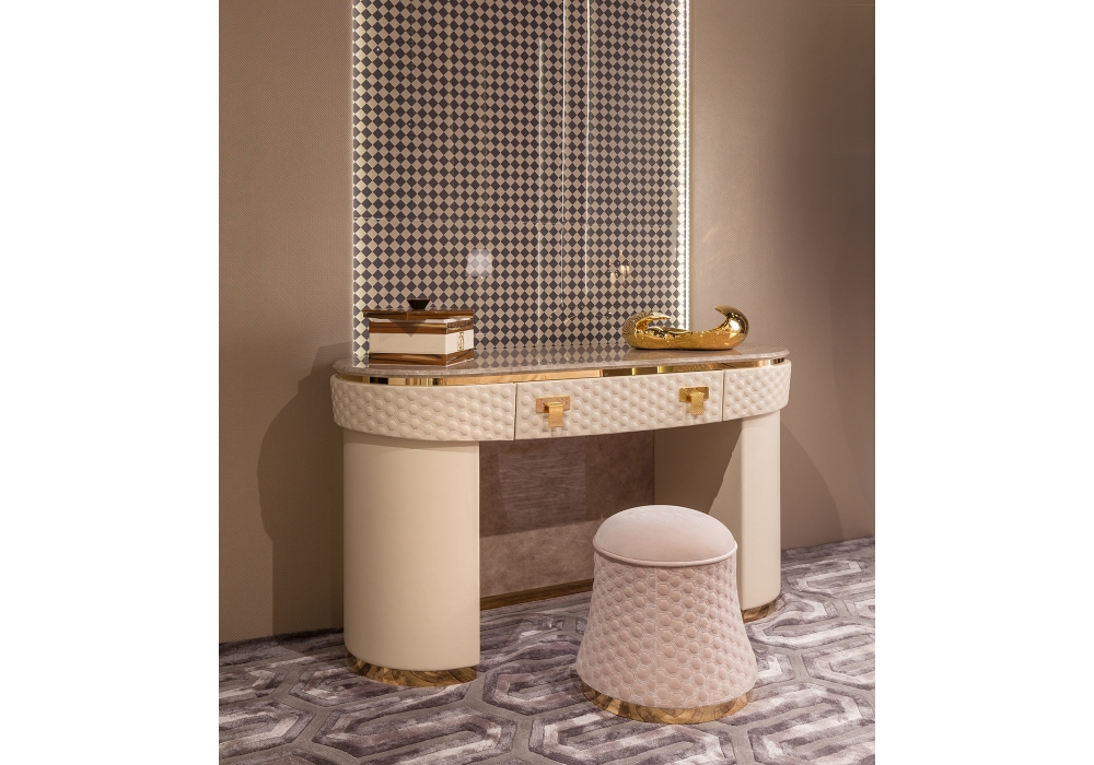 Vogue designed by Andrea Bonini for Turri is a dressing table with structure in MDF, plywood and particle board panels with a glossy finish and leather upholstery. The top is made of wood or marble. There are three drawers with external leather covering with a hexagonal pattern. Base and details in golden metal.