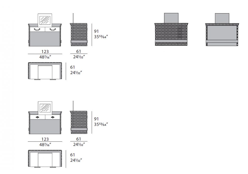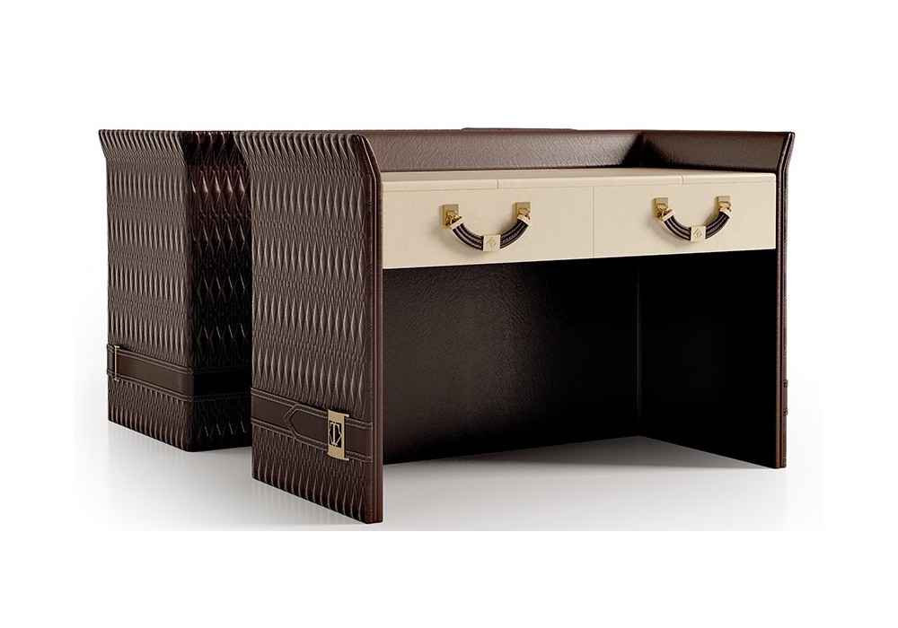 Numero Tre designed by Roberto Serio for Turri is a dressing table with structure in MDF, solid wood, plywood and particle board panels with a glossy finish. Handles in gilded metal or with leather applications. There are two drawers with microfibre lining. It is available in the version with the back in embroidered leather or in smooth matt leather