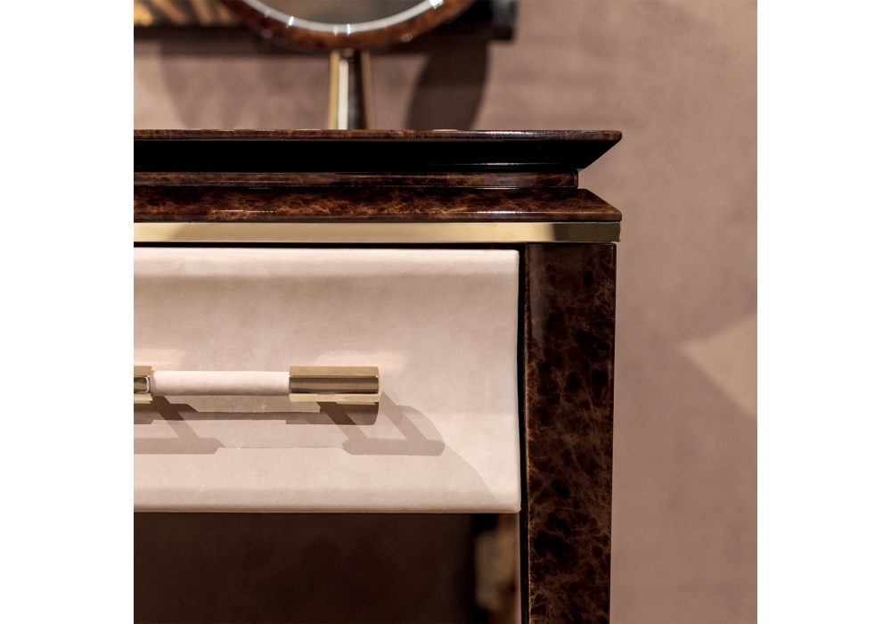 Noir designed by Andrea Bonini for Turri is a dressing table with structure in MDF and particle board panels in glossy lacquered finish, leather covering and top made of marble or wood. There is a drawer with internal lining in microfibre. Feet and metal parts in different finishes. Available in the version with or without mirror.