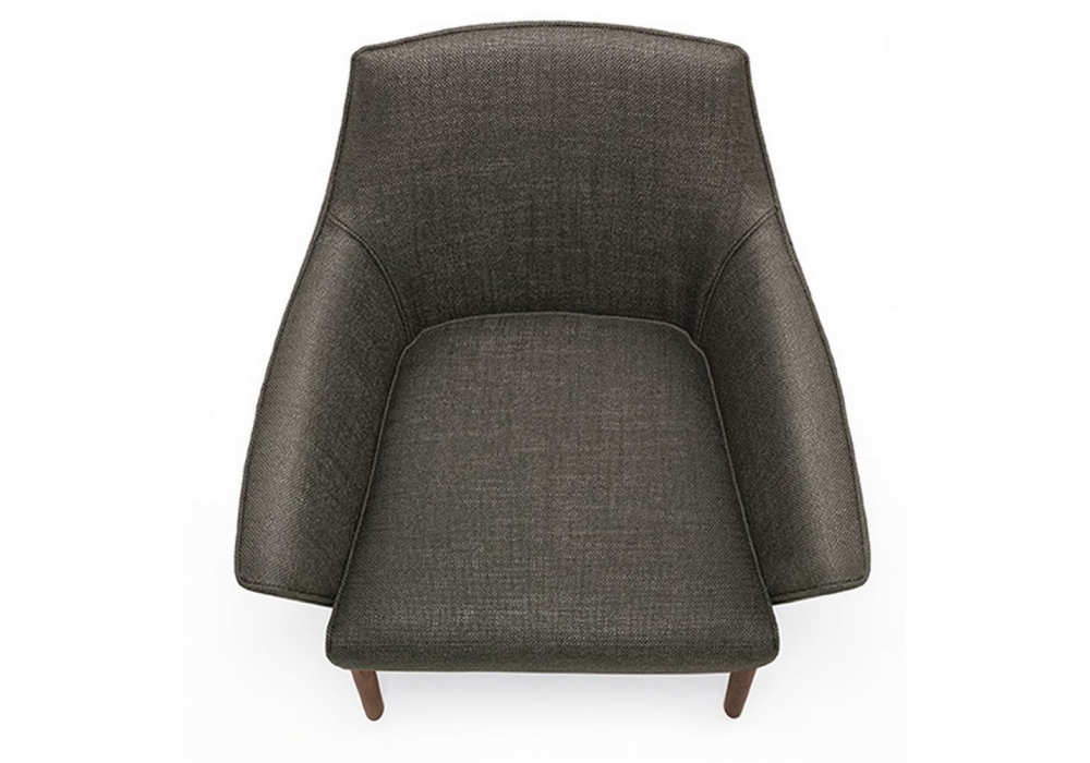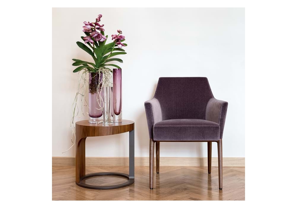 Alina designed by Antonello Mosca for Giorgetti is an armchair with structure in Polimex, with padding in flexible polyurethane foam. The base is in solid canaletto walnut or in polished solid maple, the seat is removable and covered in fabric or leather, in different finishes. The profile of the armchair is always in leather, in different colors.