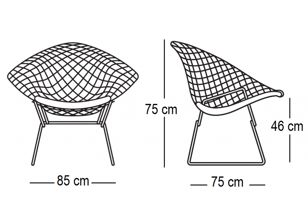 Bertoia Diamond designed by Harry Bertoia is a small armchair with a structure made of steel rods salted at each intersection in different finishes. The structure is equipped with 4 black plastic glides. Cushion covered in different fabrics or leathers.