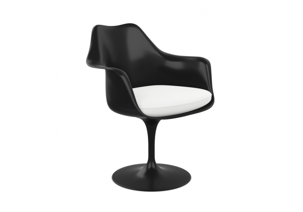 Tulip Arm Chair is a small armchair designed by Eero Saarinen for Knoll. With the Pedestal Collection, Eero Saarinen vowed to resolve the "ugly, confusing, unrestful world" underneath chairs and tables, or put more frankly, "the slum of legs." Seat shell is molded fiberglass and base is molded cast aluminum with white or black paint.