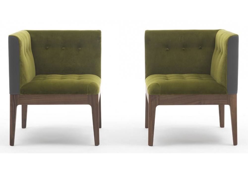 Wendy Corner designed by Carlo Ballabio for Porada is a corner easy chair with structure in solid canaletta walnut available in different finishes. Seat with capitonné decoration upholstered in fabric or leather.