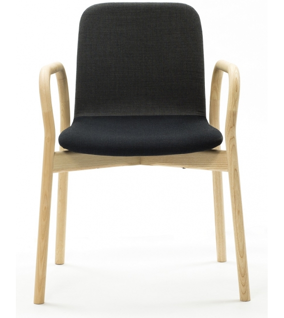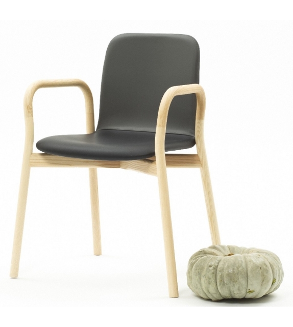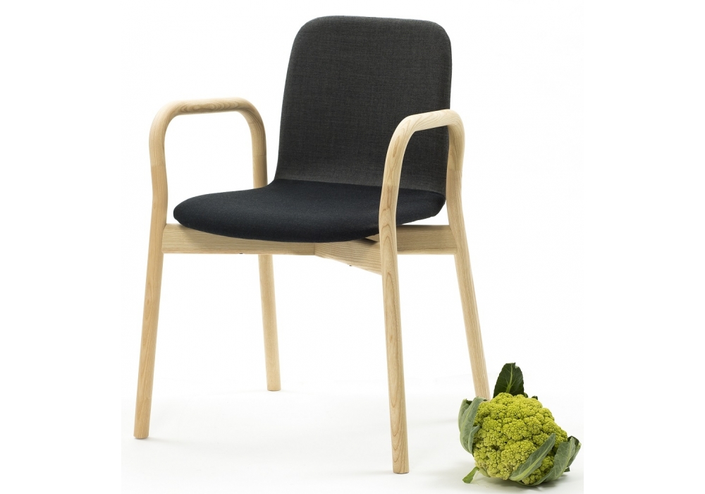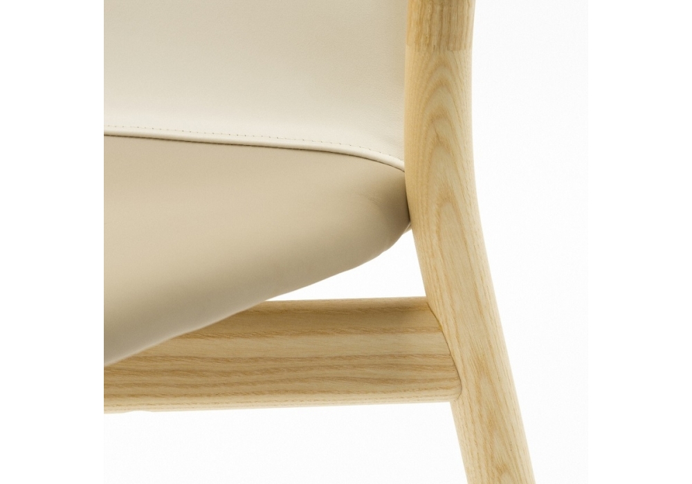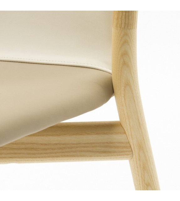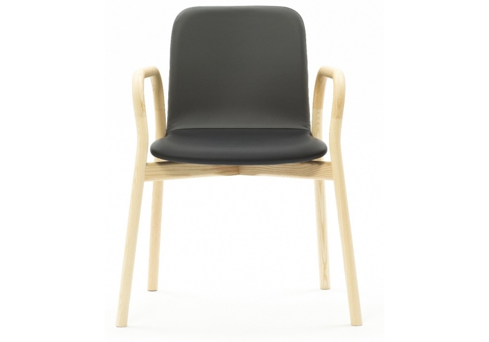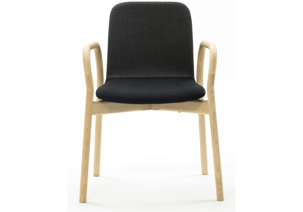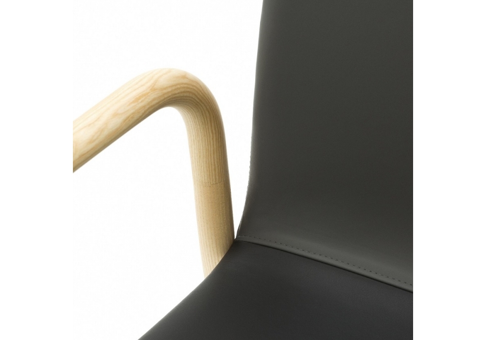 Two Tone designed by Ichiro Iwasaki for Discipline is an armchair with structure in ash with natural or black stained finish. Upholstered seat and back with fabric or leather covering, in the one-color or two-color version.