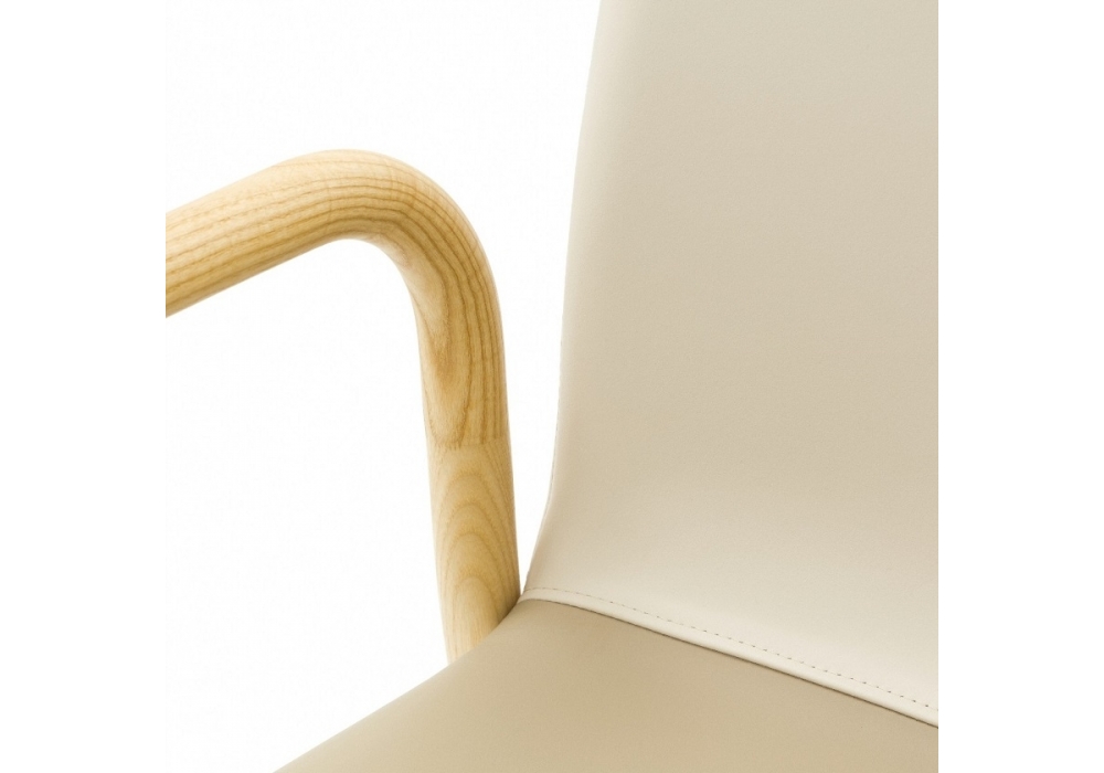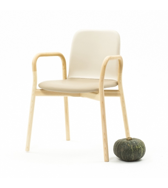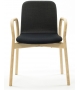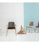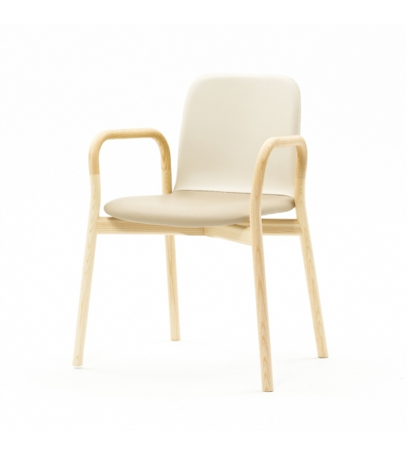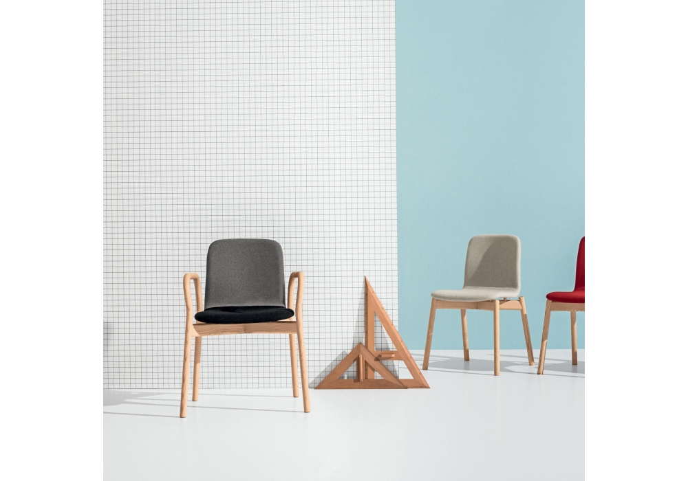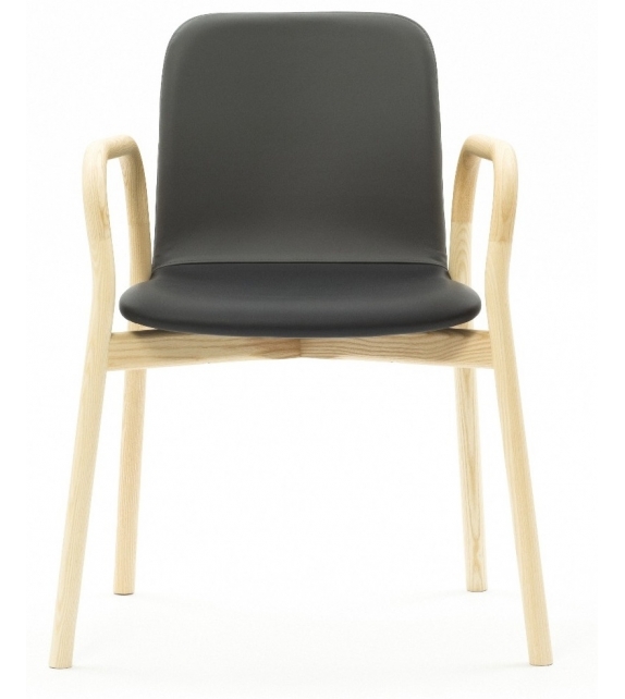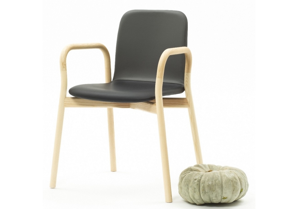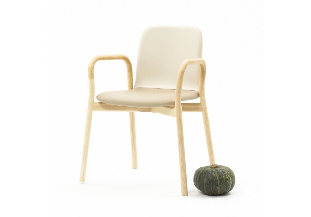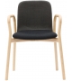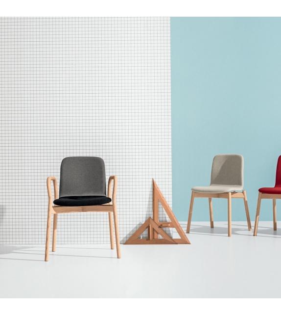 Two Tone designed by Ichiro Iwasaki for Discipline is an armchair with structure in ash with natural or black stained finish. Upholstered seat and back with fabric or leather covering, in the one-color or two-color version.