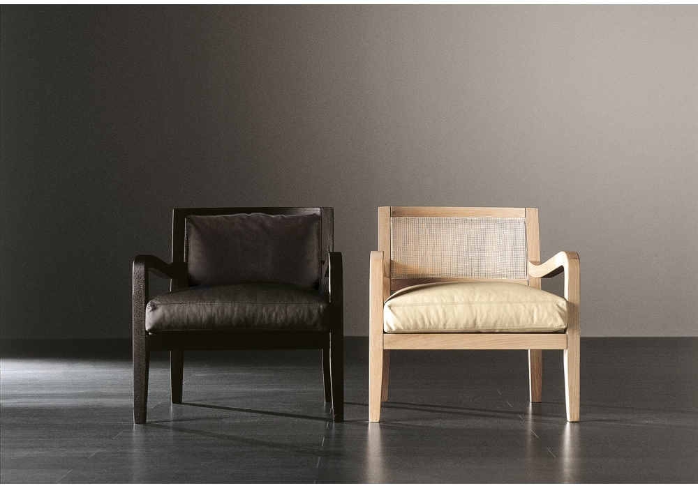 Forrest Wood designed by Andrea Parisio for Meridiani is a small armchair with wooden frame and back in stained cane. Seat and back cushions in reinforced feathers.