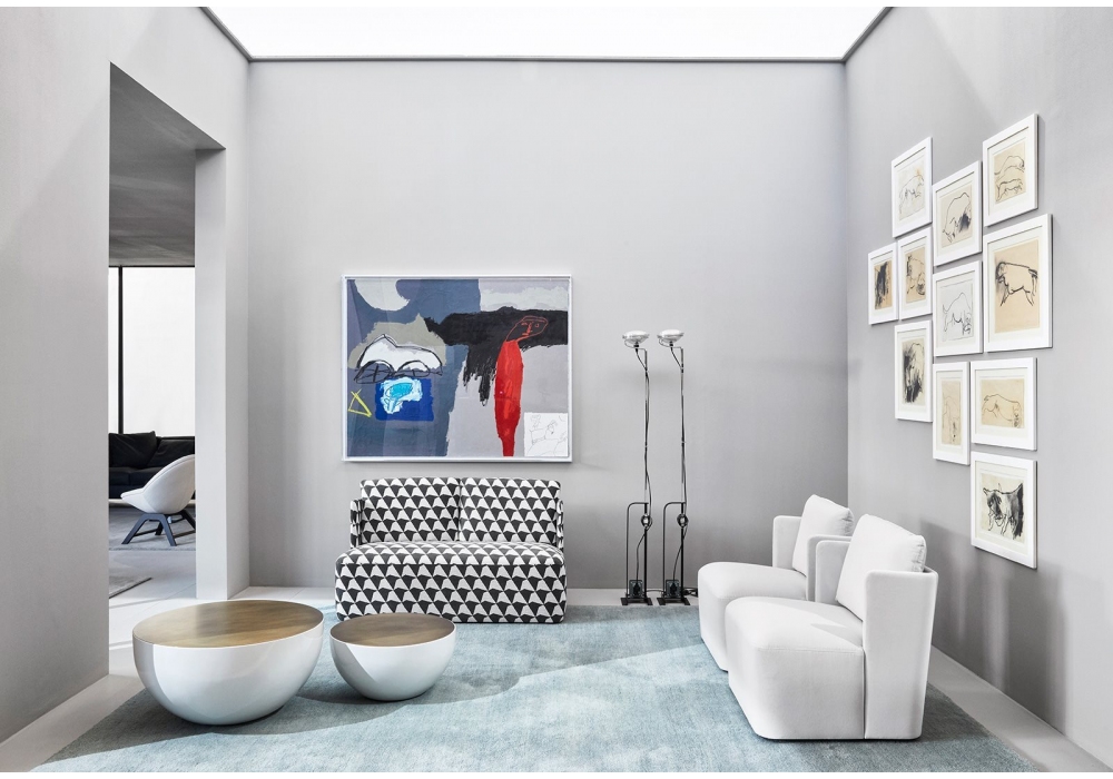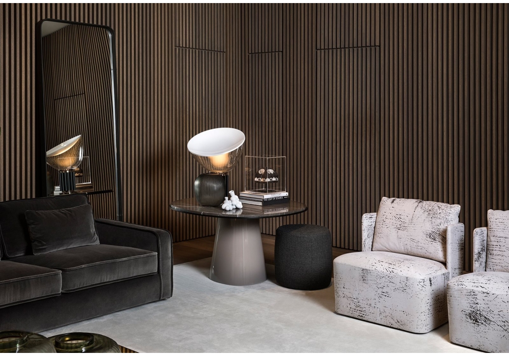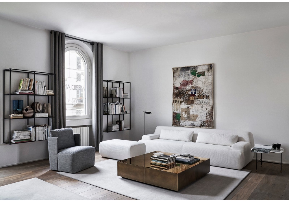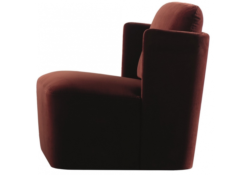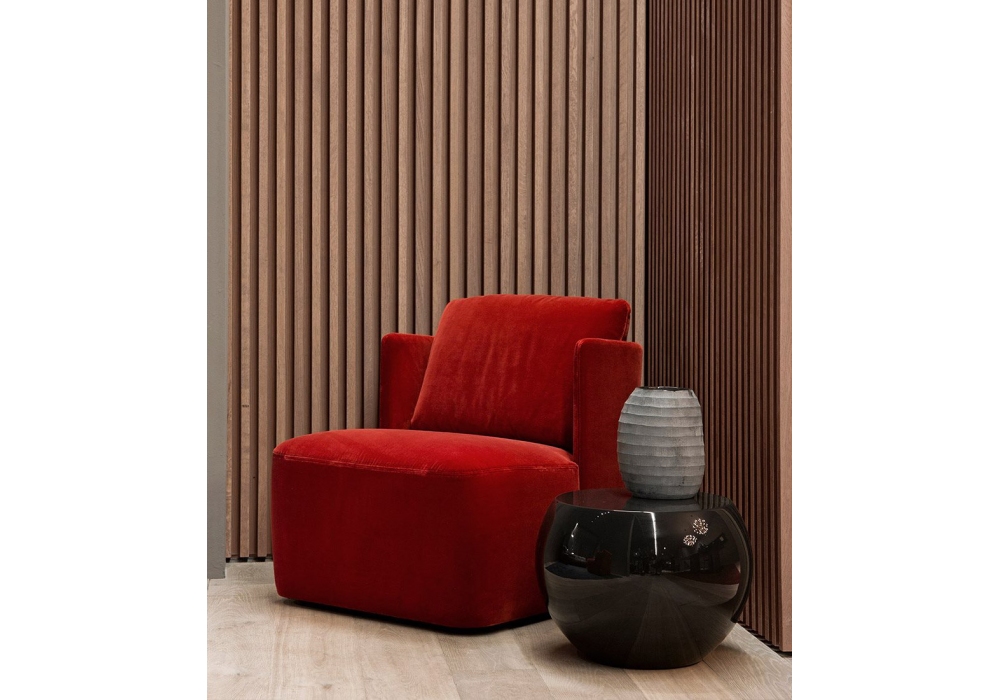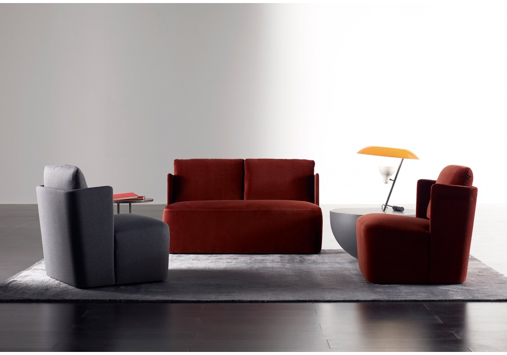 Keeton Fit designed by Andrea Parisio for Meridiani is a small armchair with backrest frame and seat/back cushions in fabric or leather. Black ABS feet.