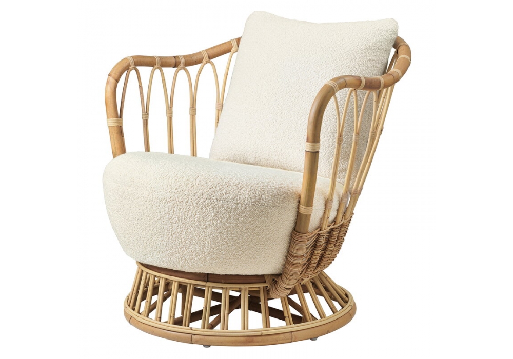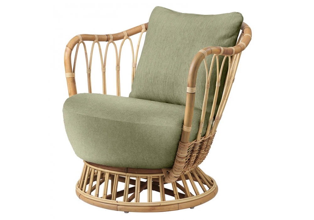 Grace designed by Tove Kindt Larsen for Gubi is a lounge chair composed of circular seat atop a slightly larger, offset, circular base, with an embracing backrest populated with long loops of rattan. The lower part of the backrest is woven together to support a generous upholstered seat cushion.