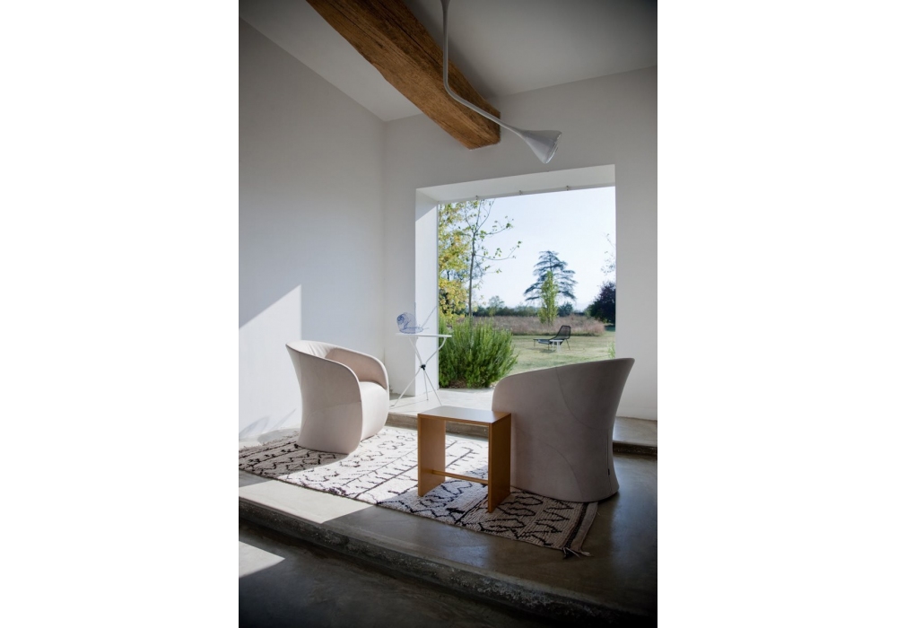 873 Calla designed by Noé Duchaufour Lawrance for Zanotta is a small armchair made with base on castors or fixed with feet, steel structure and removable fabric or leather upholstery.