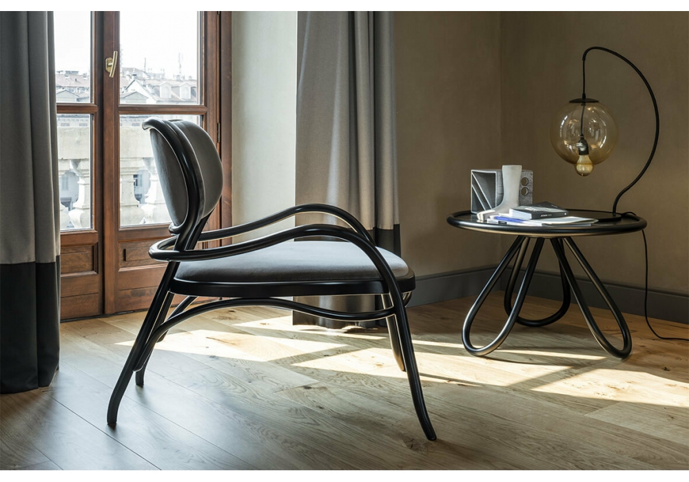 Lehnstuhl designed by Nigel Coates for Gebrüder Thonet Vienna is an armchair with structure in curved beech in different finishes. Upholstered seat with fabric or leather upholstery, backrest available in Vienna straw or upholstered in the same finish as the seat.