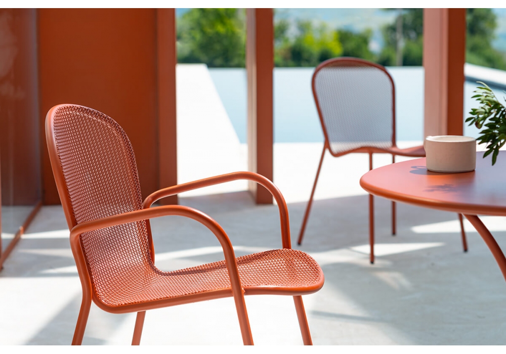 Ronda X designed by EMU is a garden armchair, the sheet metal is made soft by the shape, which follows the curves of the body, and by the design that recalls the textures of a lace. Available in different finishes.