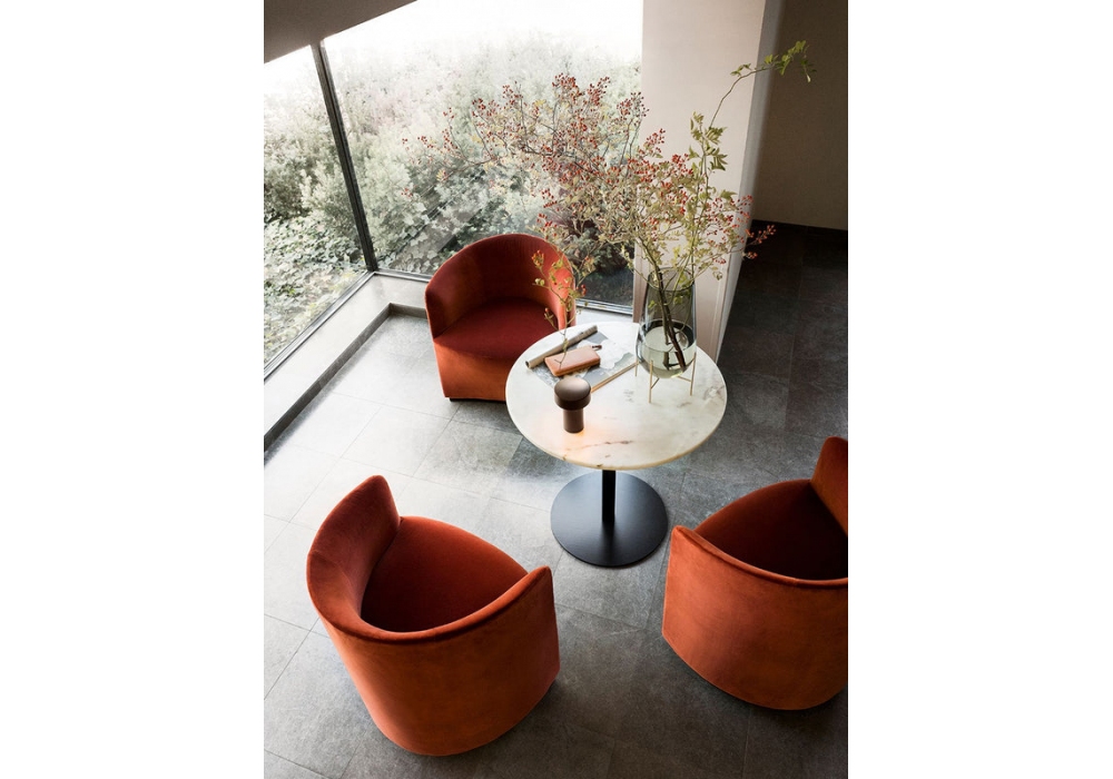Tearoom designed by Nick Ross for Audo Copenhagen is a padded armchair with fabric covering, base in black MDF. Available in different finishes and sizes.