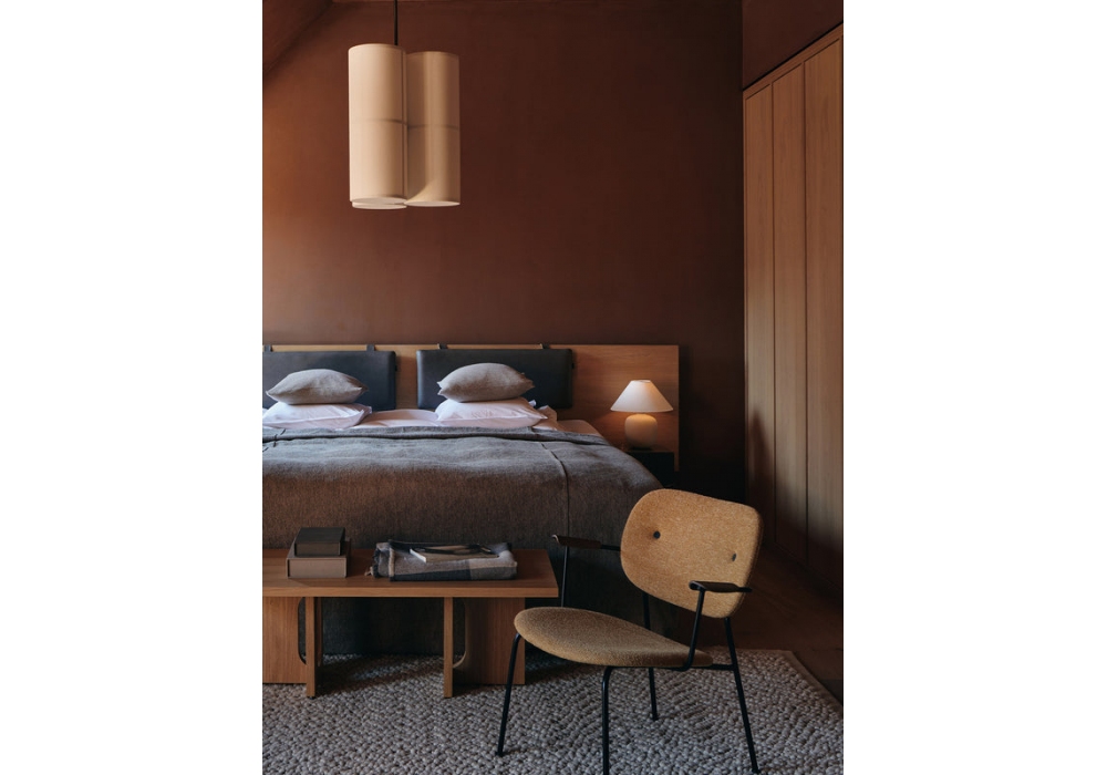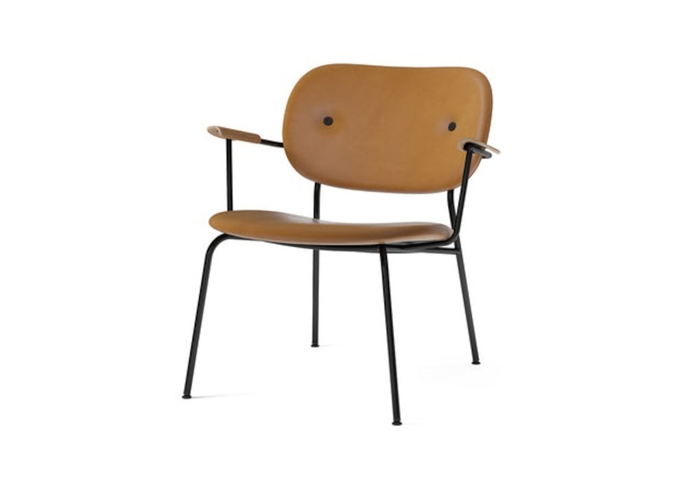 Co Fully designed by Norm Architects & Els Van Hoorebeeck for Audo Copenhagen is an armchair with upholstered seat and back covered in fabric or leather, oak armrests and black powder coated steel legs. Available in different finishes.