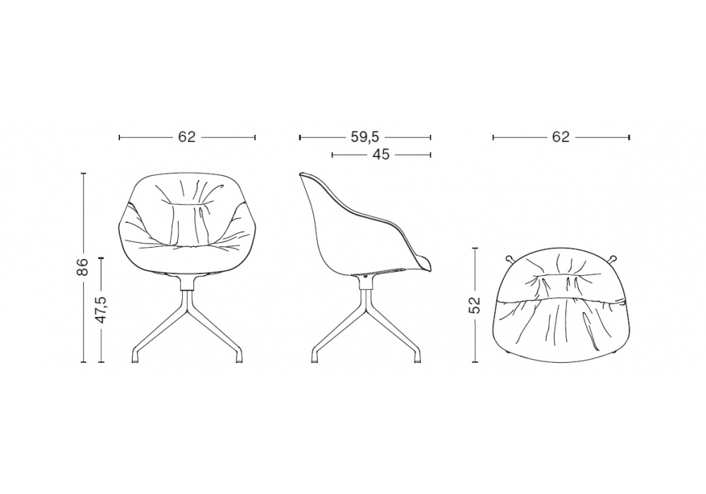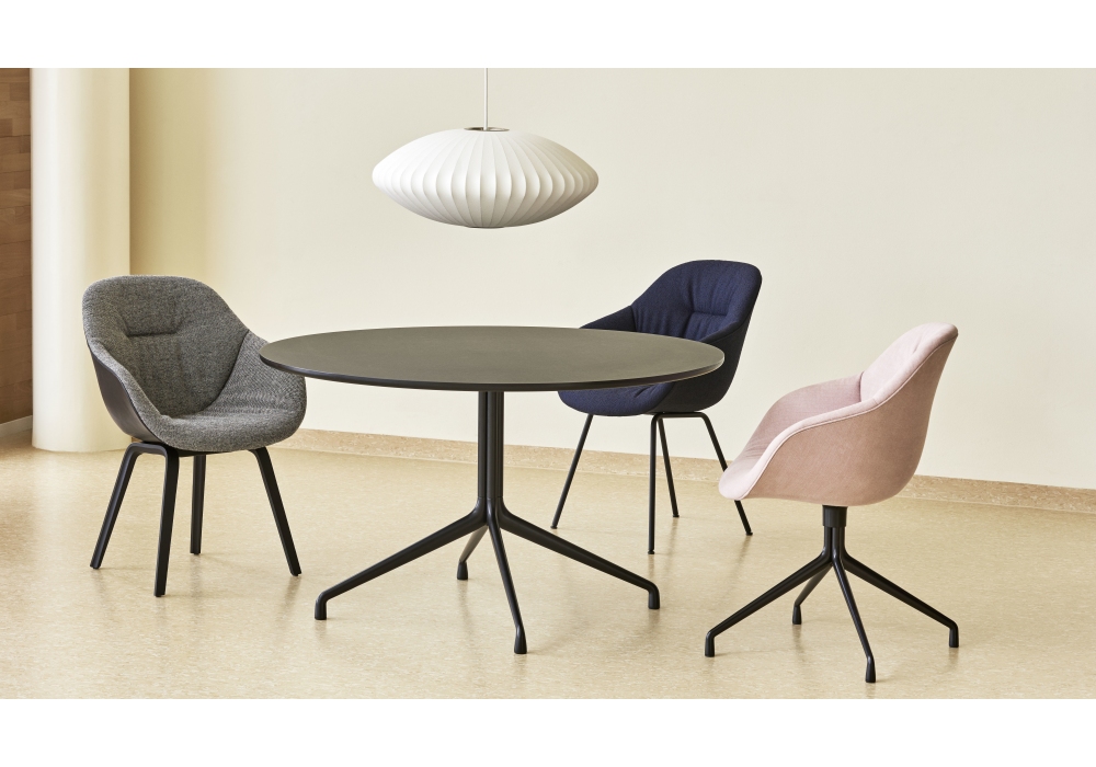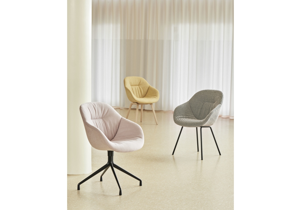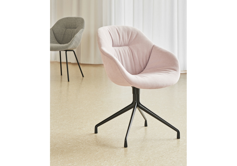 About a Chair AAC 121 Soft designed by Hee Welling & Hay for Hay is a small armchair with injection molded polypropylene shell with armrest, full upholstery and quilted front. Swivel base with 4 spokes in polished cast aluminum or black powder coated. Available in different upholstery.