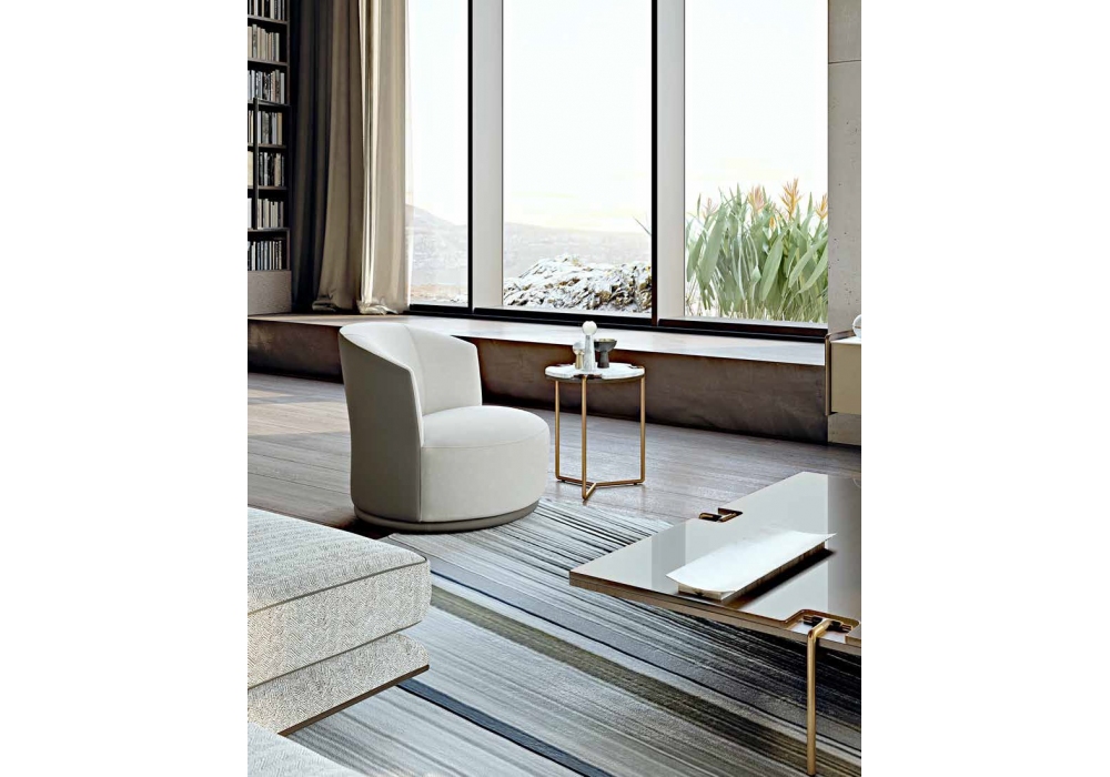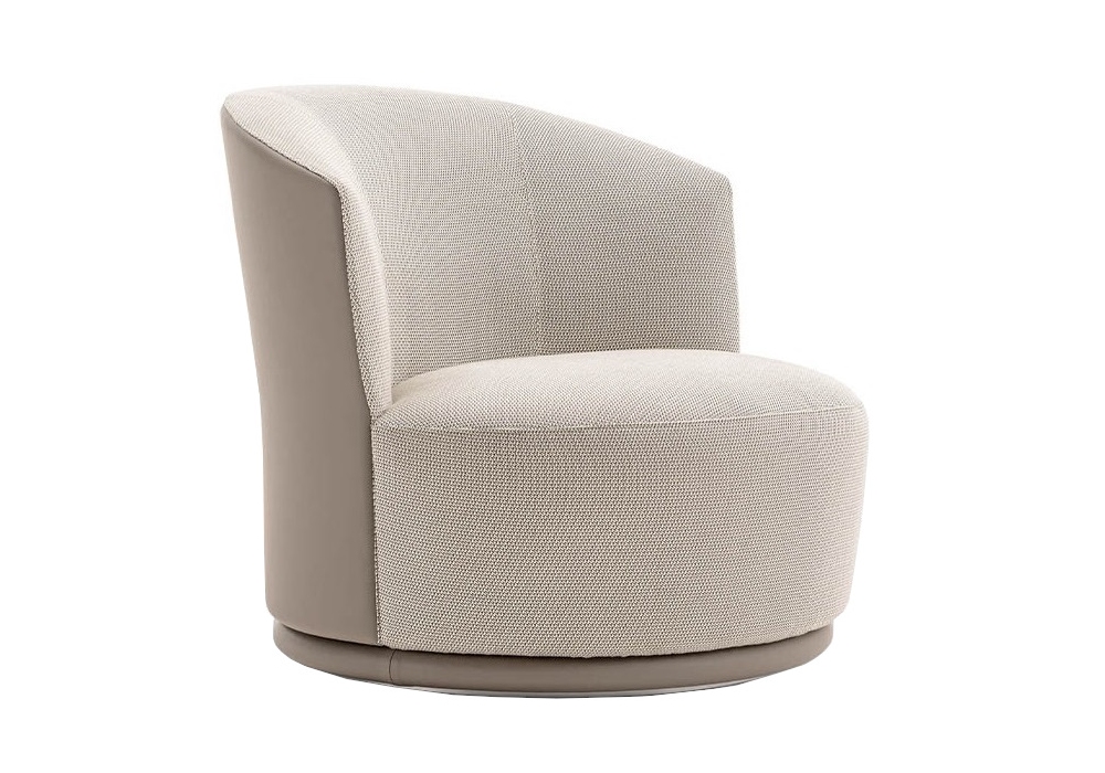 Blues designed by Giuseppe Viganò for Turri is a small armchair with structure in solid wood and plywood with padding in multi-density polyurethane foam. Shell and upholstery in different leathers and fabrics. Swivel base made of painted MDF wood.