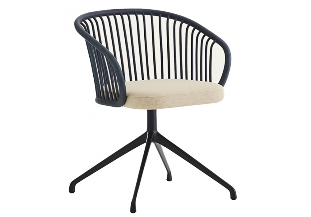 Huma designed by Mario Ruiz for Expormim is a small armchair made with structure and backrest made of colored natural rattan, metal swivel base. Upholstered seat. Available in different finishes.
