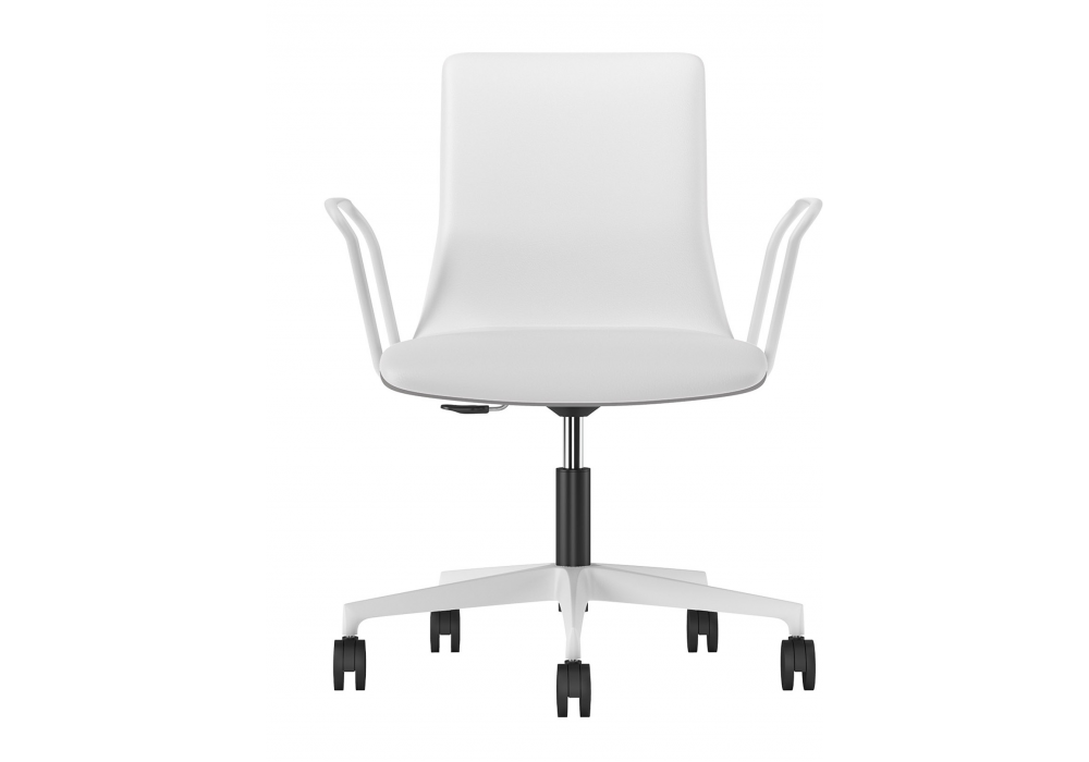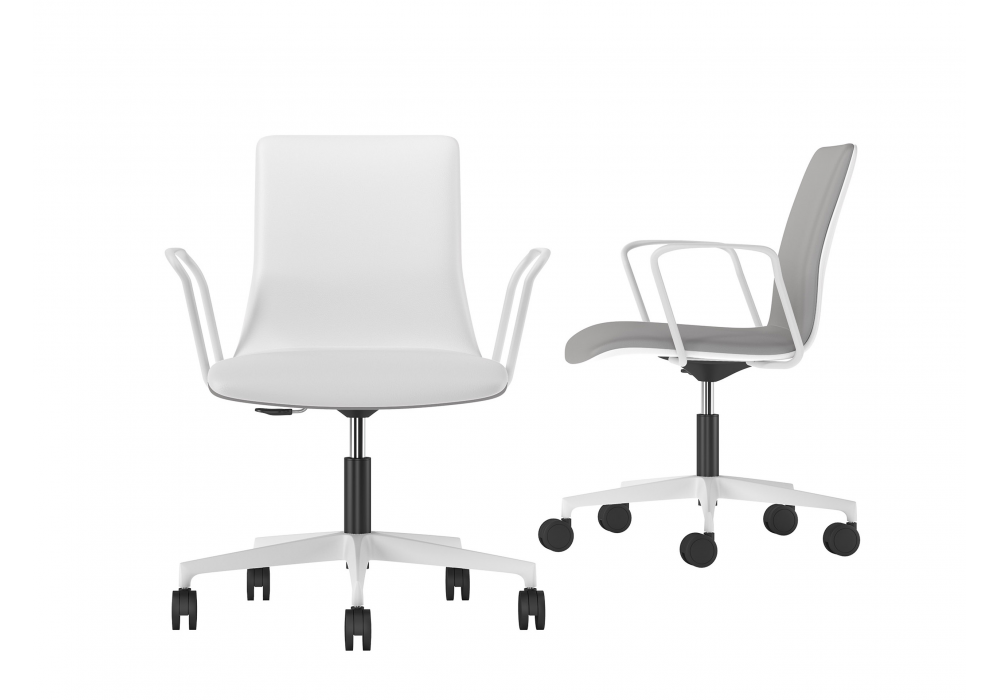 Sori designed by R&D Sitlosophy for Sitlosophy is a swivel armchair with nylon base in white or black finish. The structure consists of a single shell in curved plywood, padded with flexible polyurethane foam and upholstered in different leathers, fabrics or eco-leathers. The armrests are in epoxy powder coated steel to match the base. It is possible to adjust the height thanks to a gas lift mechanism.
