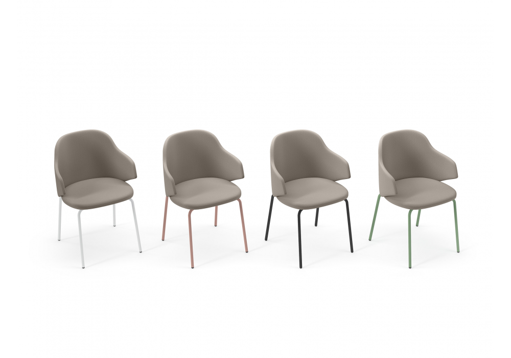 Host designed by R&D Sitlosophy for Sitlosophy is an easy chair with base in powder-coated metal or in natural varnished ash wood. The structure is in curved plywood with flexible polyurethane foam padding and upholstery in various fabrics, leathers or eco-leathers.