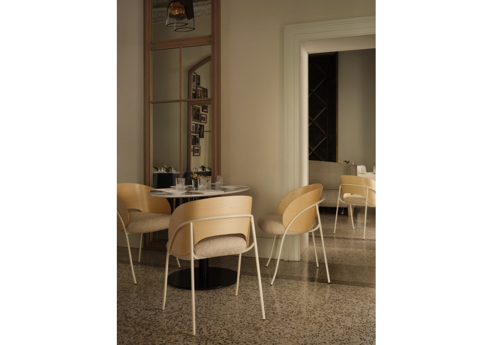 Hagu designed by Ab Concept for Gebrüder Thonet Vienna is a small armchair with tubular metal structure, backrest in ash veneered plywood, upholstered seat with fabric or leather covering. Available in different finishes.