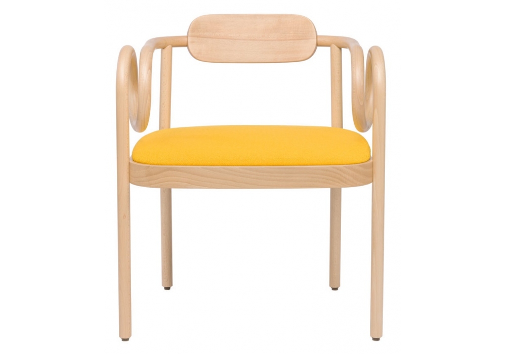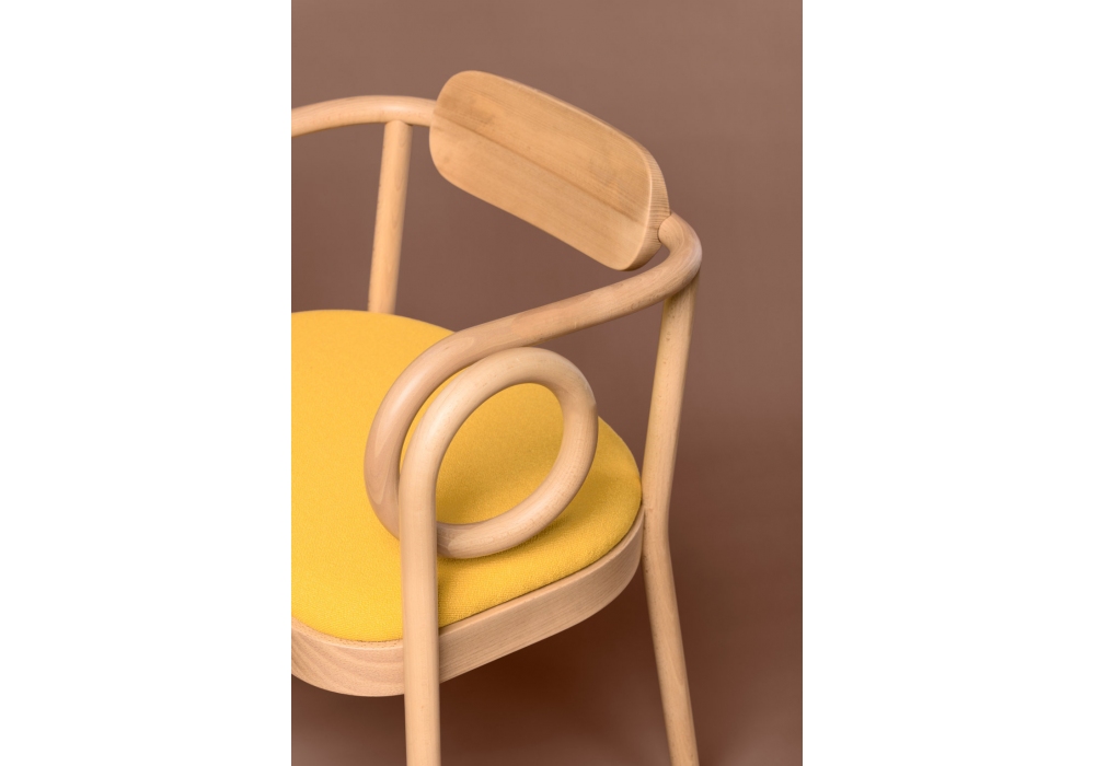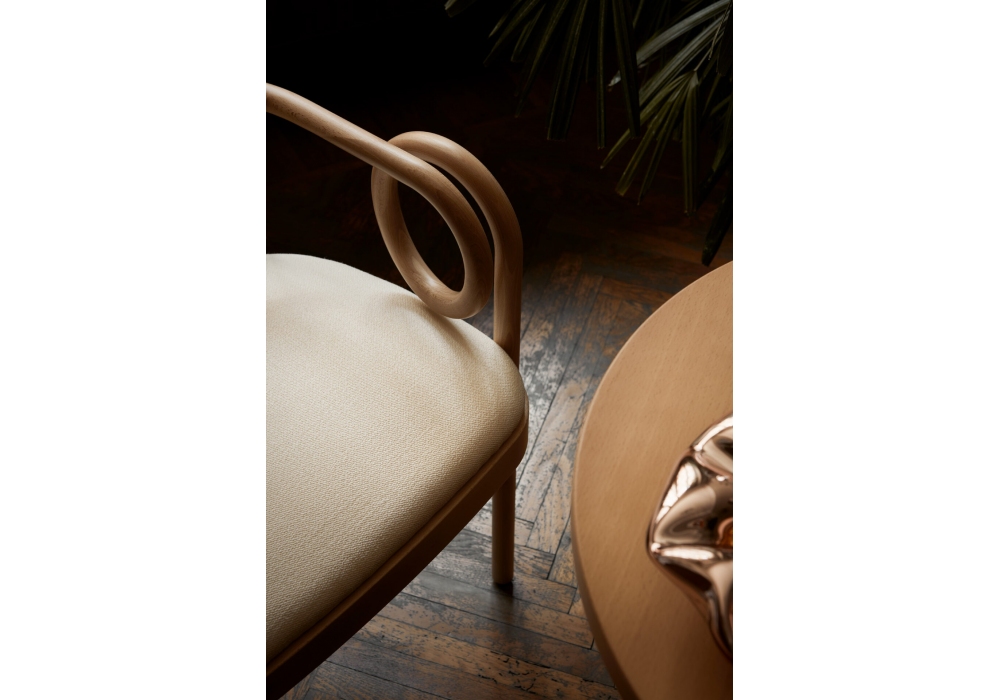 Loop Dining designed by India Mahdavi for Gebrüder Thonet Vienna is an armchair with curved beech structure. Padded seat covered in fabric or leather, wooden backrest. Available in different finishes.