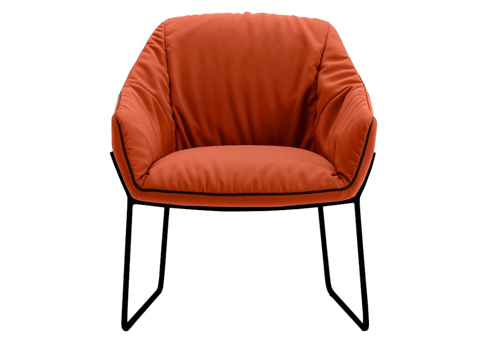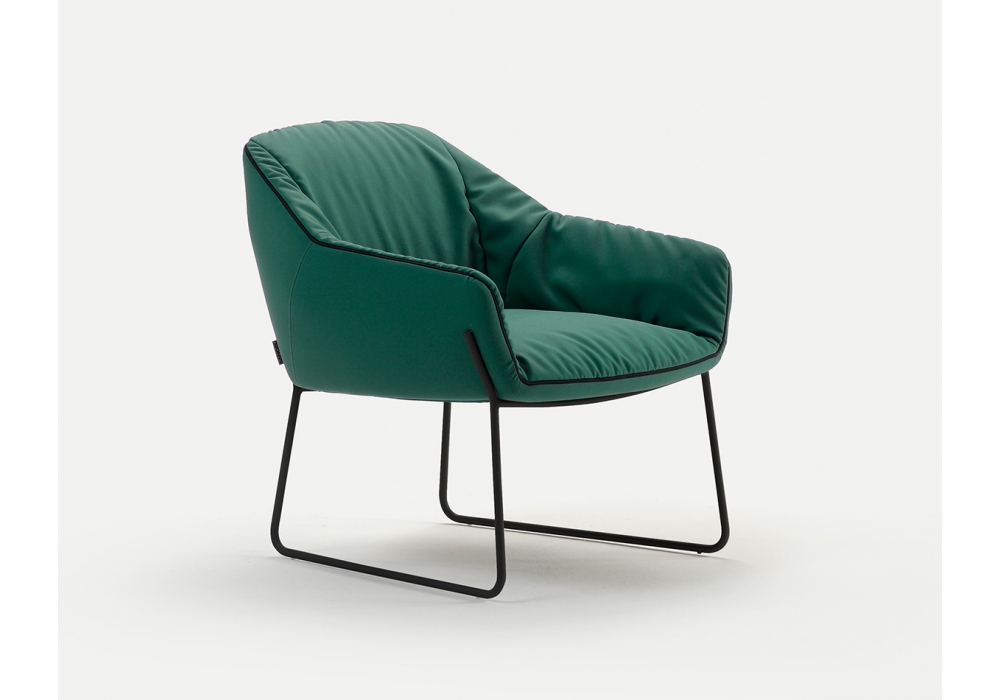 Nido Sled designed by Rafa GarcĂa for Sancal is a small armchair with sled base in lacquered metal, padded seat and backrest covered in fabric or leather. Available in different finishes.