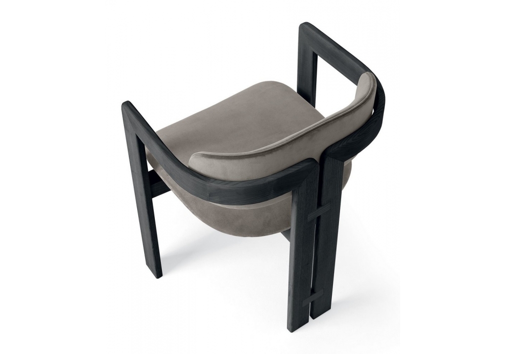 0414 designed by Studio G&R four Gallotti&Radice is an armchair with black lacquered open pore solid curved ash structure. Also available in natural ash, tobacco stained or white open pore lacquered ash. Curved plywood seat and backrest with polyurethane foam padding covered by fabric or leather as per samples.