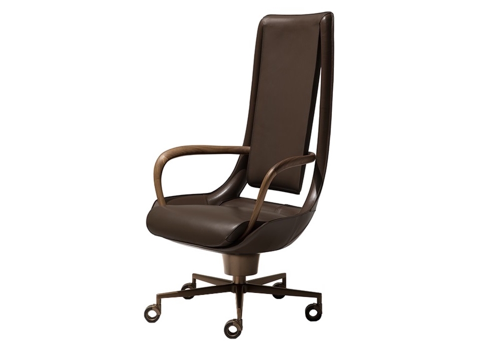 Clip designed by M2Atelier for Giorgetti is an executive wing chair with back structure in profiled steel, seat in Polimex and armrests in solid walnut canaletto wood. The padding is in expanded polyurethane. Revolving base with rotating castors, gas spring for height regulation and tilt mechanism. The castors, the base and the structure are painted in bronze colour with natural effect. The upholstery, not removable, is available in saddle leather or leather.