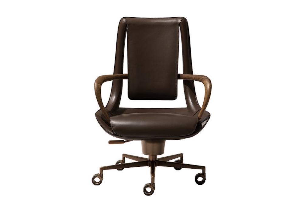 Clip designed by M2Atelier for Giorgetti is an armchair with back structure in profiled steel, seat in Polimex and armrests in solid walnut canaletto wood. The padding is in expanded polyurethane. Revolving base with rotating castors, gas spring for height regulation and tilt mechanism. The castors, the base and the structure are painted in bronze colour with natural effect. The upholstery, not removable, is available in saddle leather or leather.