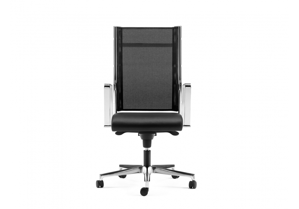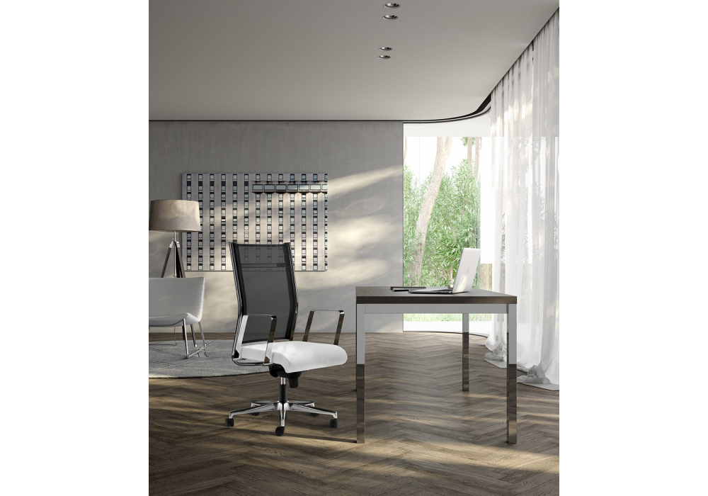 Syncronet designed by R&D Sitlosophy for Sitlosophy is an armchair with seat in pressed plywood, backrest in chromed steel with load-bearing mesh and fixed armrests in chromed steel, adjustable in height, with sliding polypropylene pad. Padding in flexible polyurethane foam covered in different leathers, eco-leathers or fabrics.