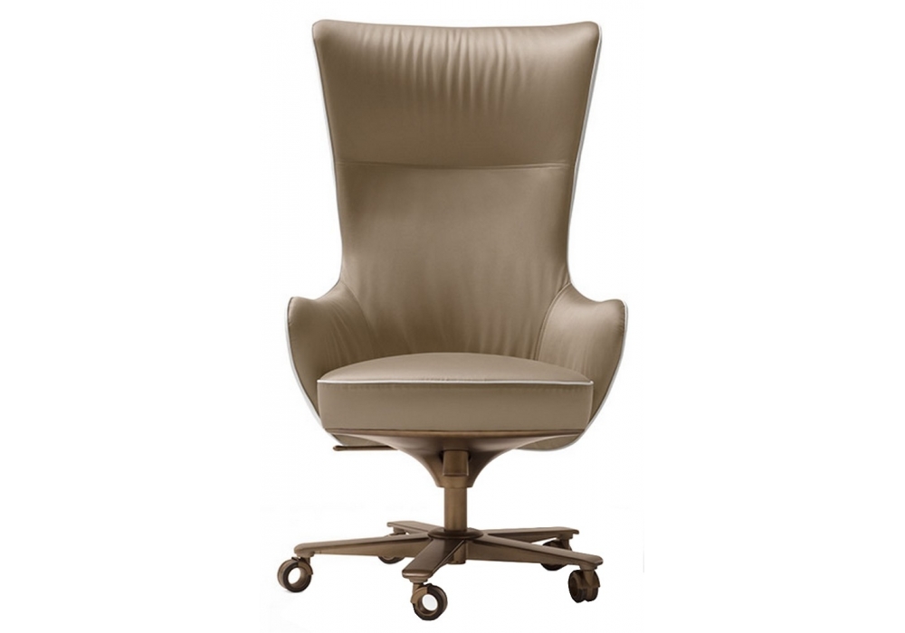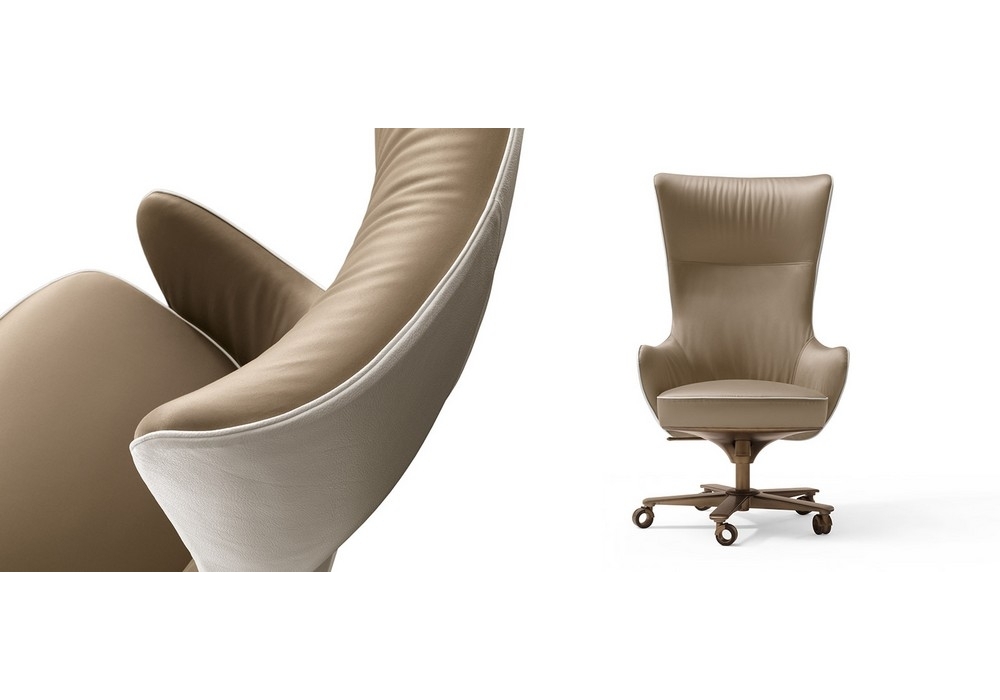 Genius is a wing chair designed by Roberto Lazzeroni for Giorgetti. Armchair with the structure of the back in profiled steel and the seat in poplar plywood. The padding is in flexible coldfoamed polyurethane covered with fibre. The wing chiar have a 5 point revolving base, rotating castors, gas spring for height regulation and a tilting mechanism for positioning. The wheels, the base and the connection between the base and the seat are painted in a bronze colour with natural effect. The not removable upholstery is available in two colours with the external side in leather and the internal one in fabric or leather.