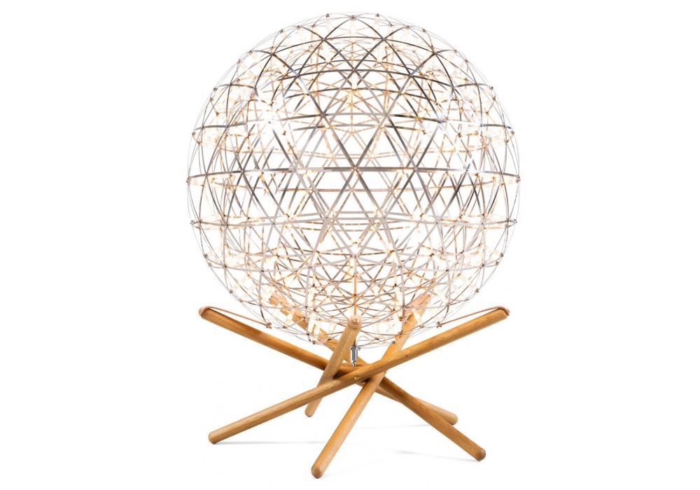 Raimond II Tensegrity designed by Raimond Puts for Moooi is a dimmable LED floor lamp with stainless steel sphere with PMMA lenses, wooden legs and leather straps. Transparent cable.