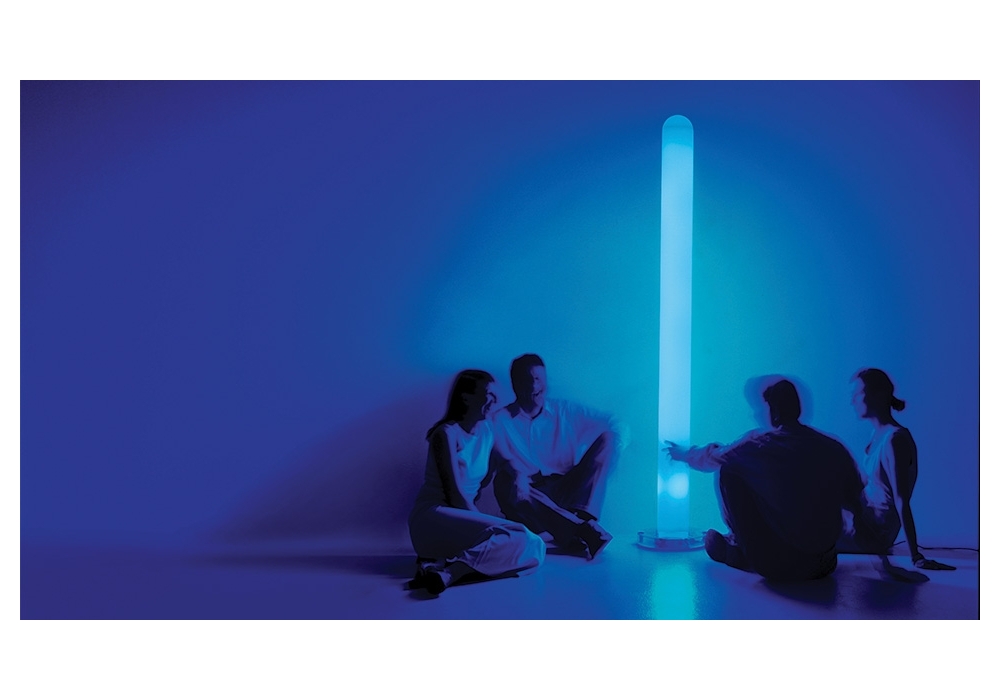 Metacolor designed by Ernesto Gismondi for Artemide is a floor lamp Floor lamp with steel base. The diffuser has a cylindrical shape in opal acrylic which uses RGB source technology, capable of obtaining infinite lighting atmospheres. Thanks to its remote control it is possible to manage 10 pre-set lightings, and to record another 10 by acting on intensity, color and brightness. On the base there is a display that indicates the type of atmosphere currently selected.