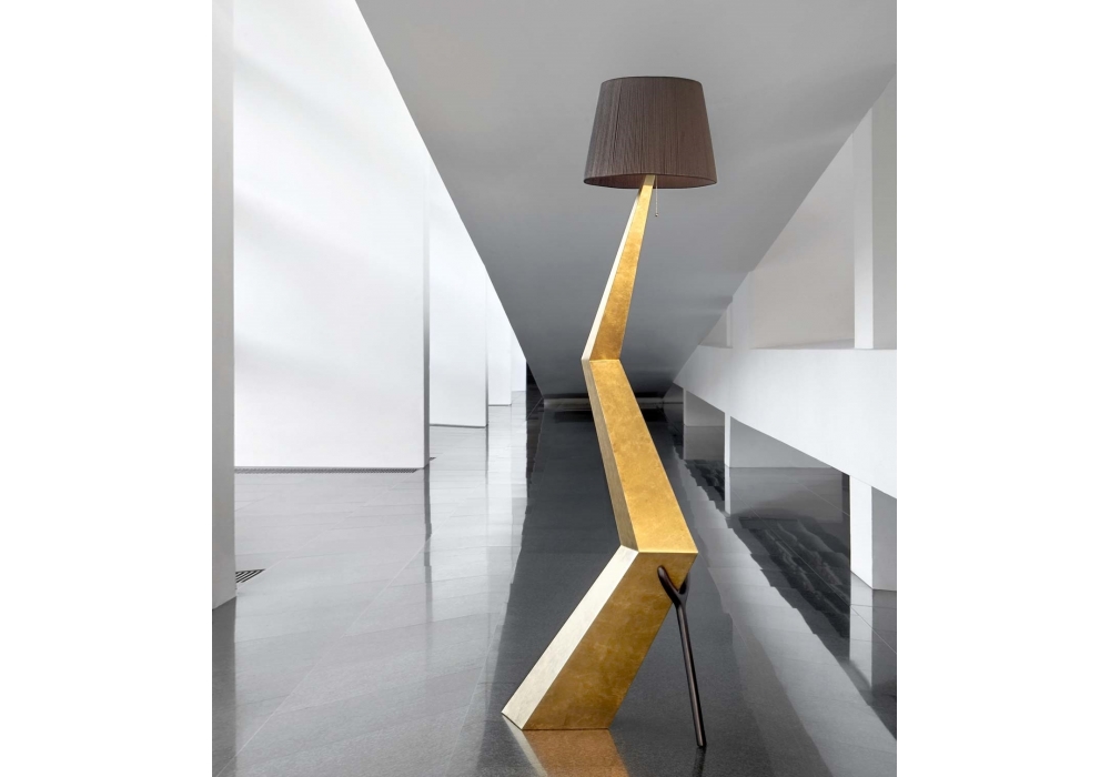 Bracelli designed by Salvador Dalí for BD Barcelona Design is a floor lamp has a wooden plank structure covered with a fine gilding also available in a darker version. The lampshade is covered in ivory-colored cotton and rayon fabric.