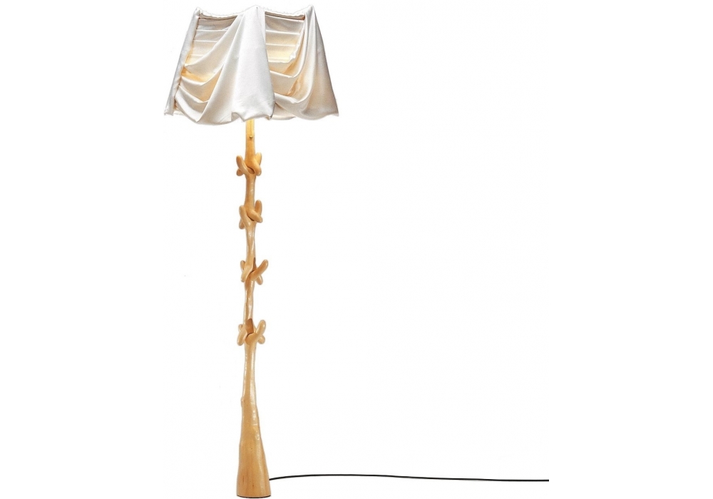 Muletas designed by Salvador Dalí for BD Barcelona Design is a floor lamp made of bleached, varnished or black stained and varnished linden wood. The lampshade is covered in beige satin or lined and covered in transparent black chiffon.