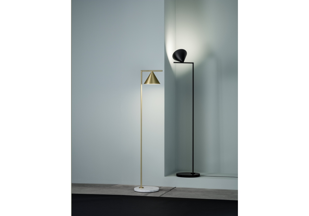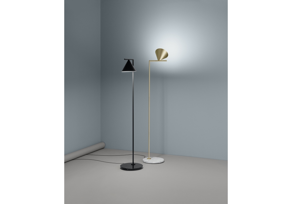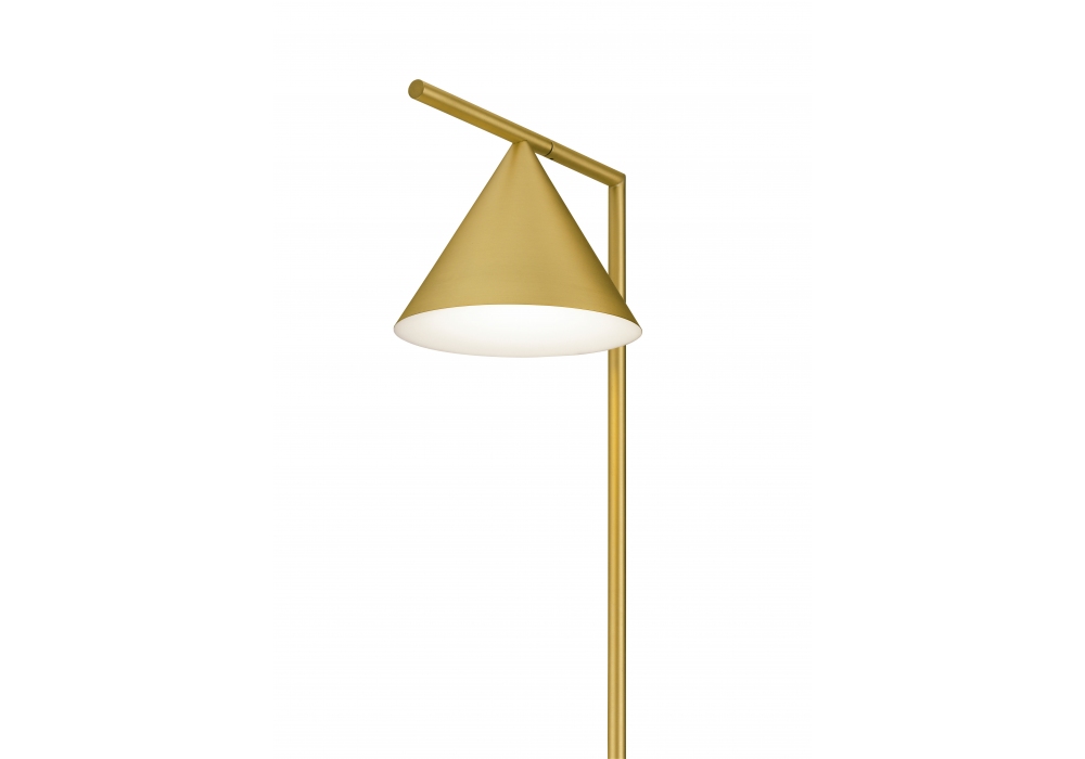 Captain Flint designed by Michael Anastassiades for Flos is a floor lamp with direct, adjustable light. Rod and cone in painted steel or brushed brass. Diffuser in injection-molded photo-etched opal polycarbonate. Foot dimmer switch that guarantees the ON/OFF functions and 10-100% light flow regulation. Plug-in power supply with interchangeable plugs. LED light source included.