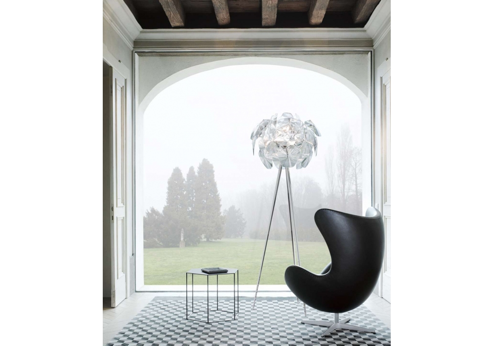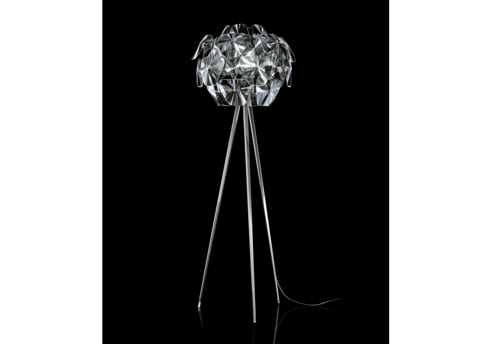 Hope designed by Francisco Gomez Paz and Paolo Rizzatto for Luceplan is a floor lamp with structure in polished steel and transparent polycarbonate. Diffuser made with methacrylate prismatic lenses. The brightness is controlled via a foot dimmer.