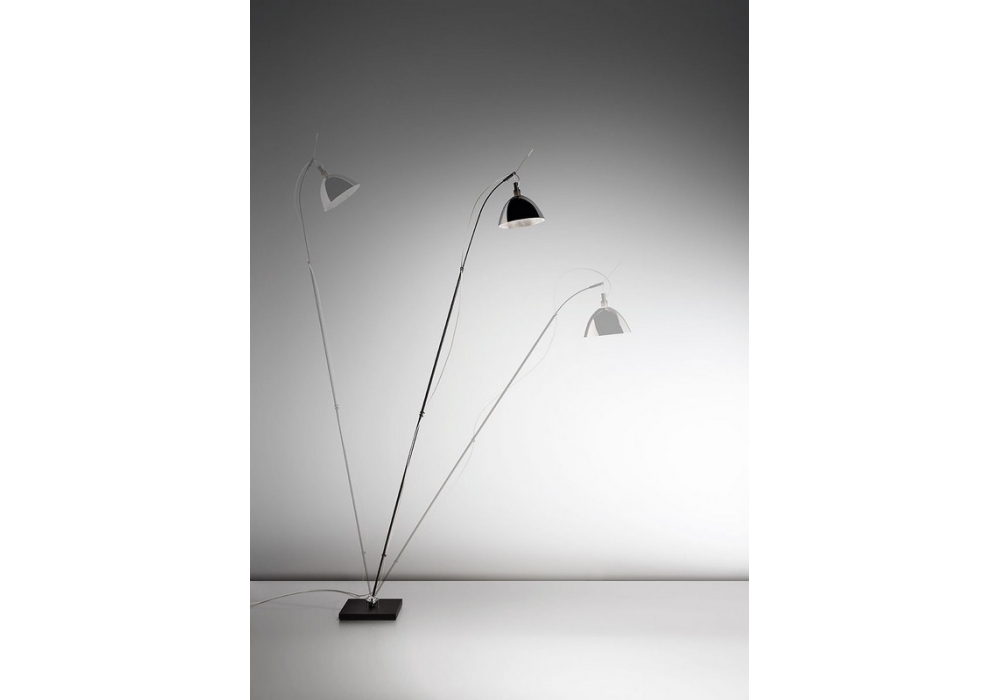 Max. Floor designed and produced by Ingo Maurer is a floor lamp in pure aluminum and stainless steel. Continuously rotatable and tiltable in all directions via a ball joint. The diffuser is available in polished aluminum or matt black.