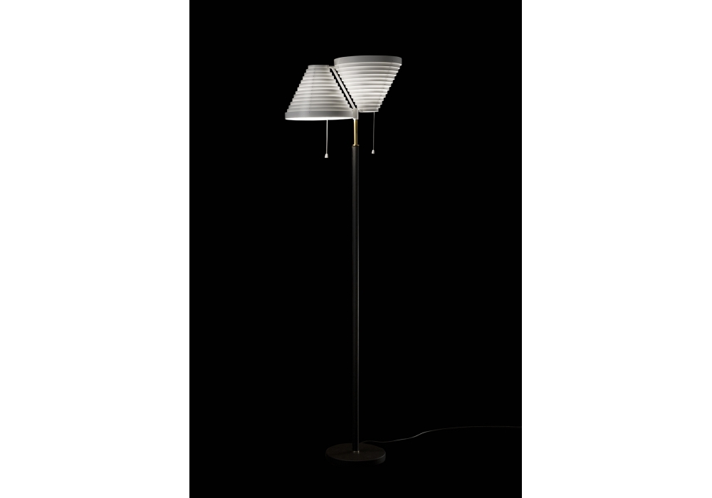 The A810 Floor Lamp is designed by Alvat Aalto for Artek. Hand-riveted, louvered steel shade painted white. Base and stand covered with black leather, black plastic cable 250 cm, upper part polished brass, upper part stainless steel.